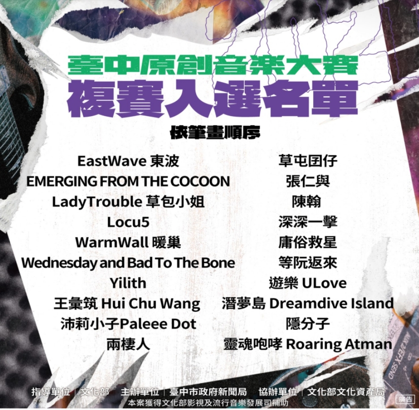 台中市政府新聞局表示,台中原創音樂大賽自412日徵件至514日止,收到來自全國各地超過200組創作者報名初賽,評審從詞曲創意、演唱技巧、演奏技巧、編曲創意等面向評分,選出20組樂團進入複賽,包含EastWave東波、EMERGING FROM THE COCOONLadyTrouble草包小姐、Locu5WarmWall暖巢、Wednesday and Bad To The BoneYilith、王彙筑Hui Chu Wang、沛莉小子Paleee Dot、兩棲人、草屯囝仔、張仁與、陳翰、深深一擊、庸俗救星、等阮返來、遊樂ULove、潛夢島 Dreamdive Island、隱分子、靈魂咆哮 Roaring Atman