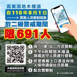 高美濕地木棧道年度維護工程順利完成,將自8月1日起重新開放民眾進入,並持續落實防疫實施人流管制,人數以691人為限,採1進1出方式控管;且為維護民眾安全,每日18時關閉木棧道,並視每日潮汐情況調整時間,呼籲遊客到訪前可先上網查詢開放時段,到訪後也須遵守野生動物保護區與防疫相關規定,避免受罰。