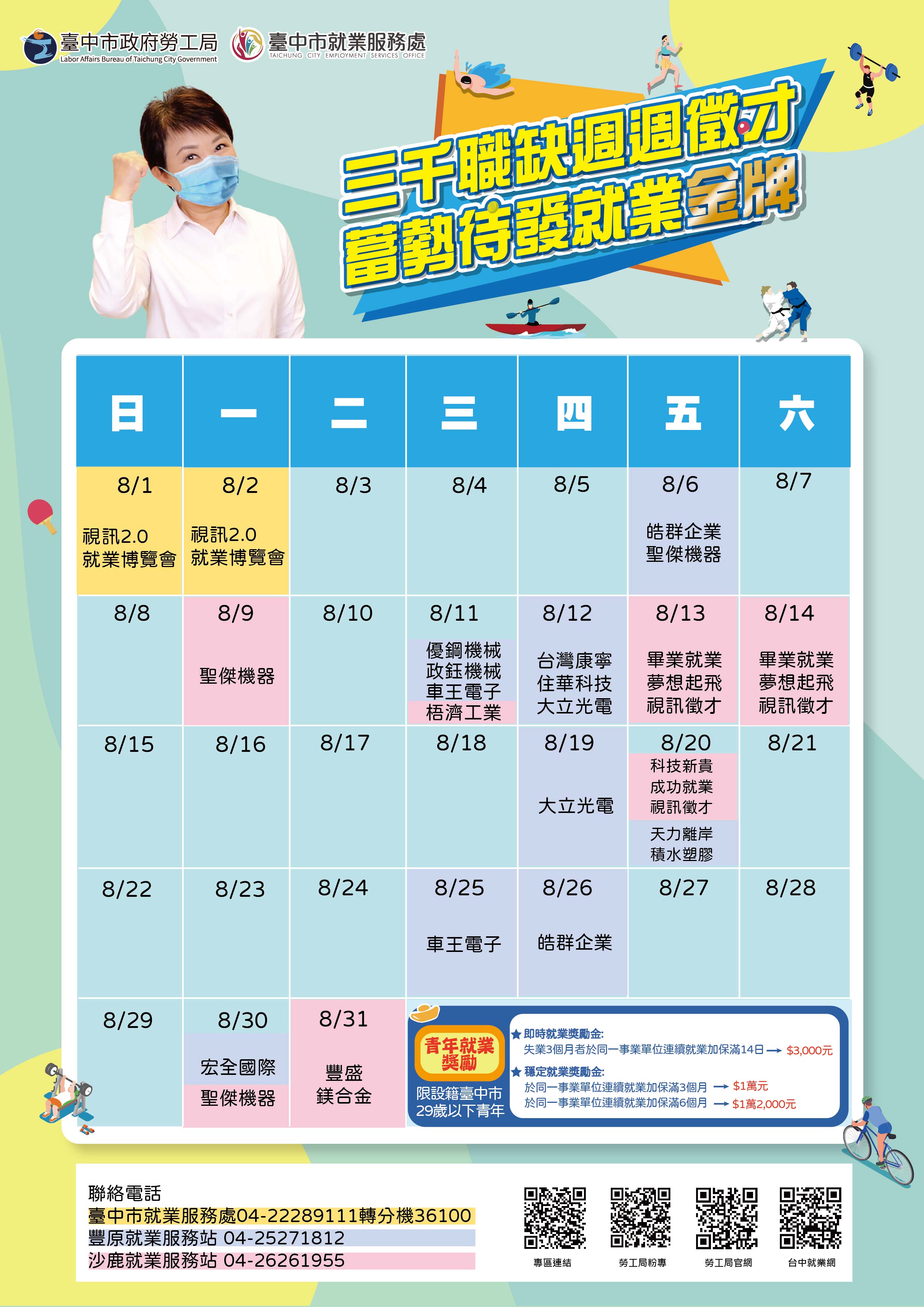 台中市就業服務處補充說明,為協助青年渡過職場適應期進而站穩職場,設籍台中市29歲以下青年,如經就業服務處所轄各就業服務據點推介就業成功,連續就業滿3個月及6個月,可分別請領1萬元及12千元獎勵金,歡迎符合資格的青年多加利用!徵才活動詳情請至台中市就業服務處官網(https://www.eso.taichung.gov.tw/2557613/post)、電洽1999市民一碼通或撥打市府總機轉36100洽詢。(8/7*17)*勞工局