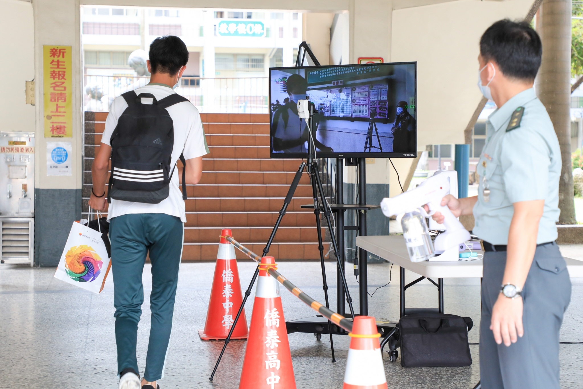 僑泰高中主任秘書許富雄說明,學生每日進入校園前需於入口處量測體溫,若學生體溫過高則先安排至一旁側邊帳篷休息再行量測,若學生在上課期間出現發燒狀況,則先將發燒學生帶至健康中心確認狀況,如持續發燒則安置於隔離教室,並通知家長評估後續醫療處置。(8/18*6)*教育局