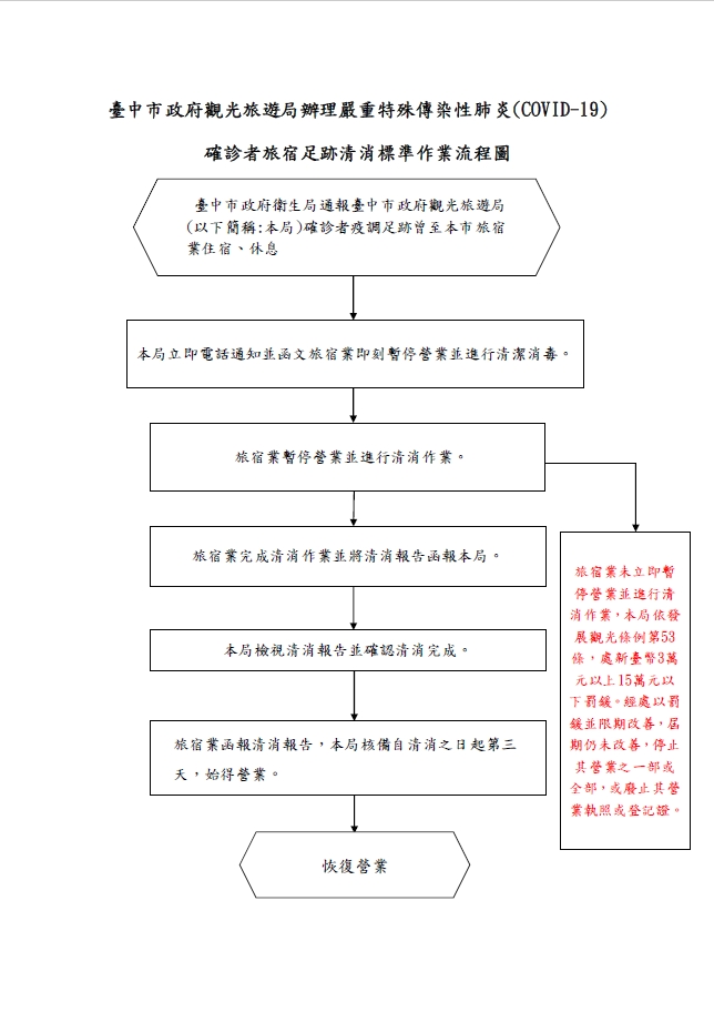 一、臺中市政府衛生局通報臺中市政府觀光旅遊局(以下簡稱:本局)確診者疫調足跡曾至本市旅宿業住宿、休息,即啟動清消作業SOP。