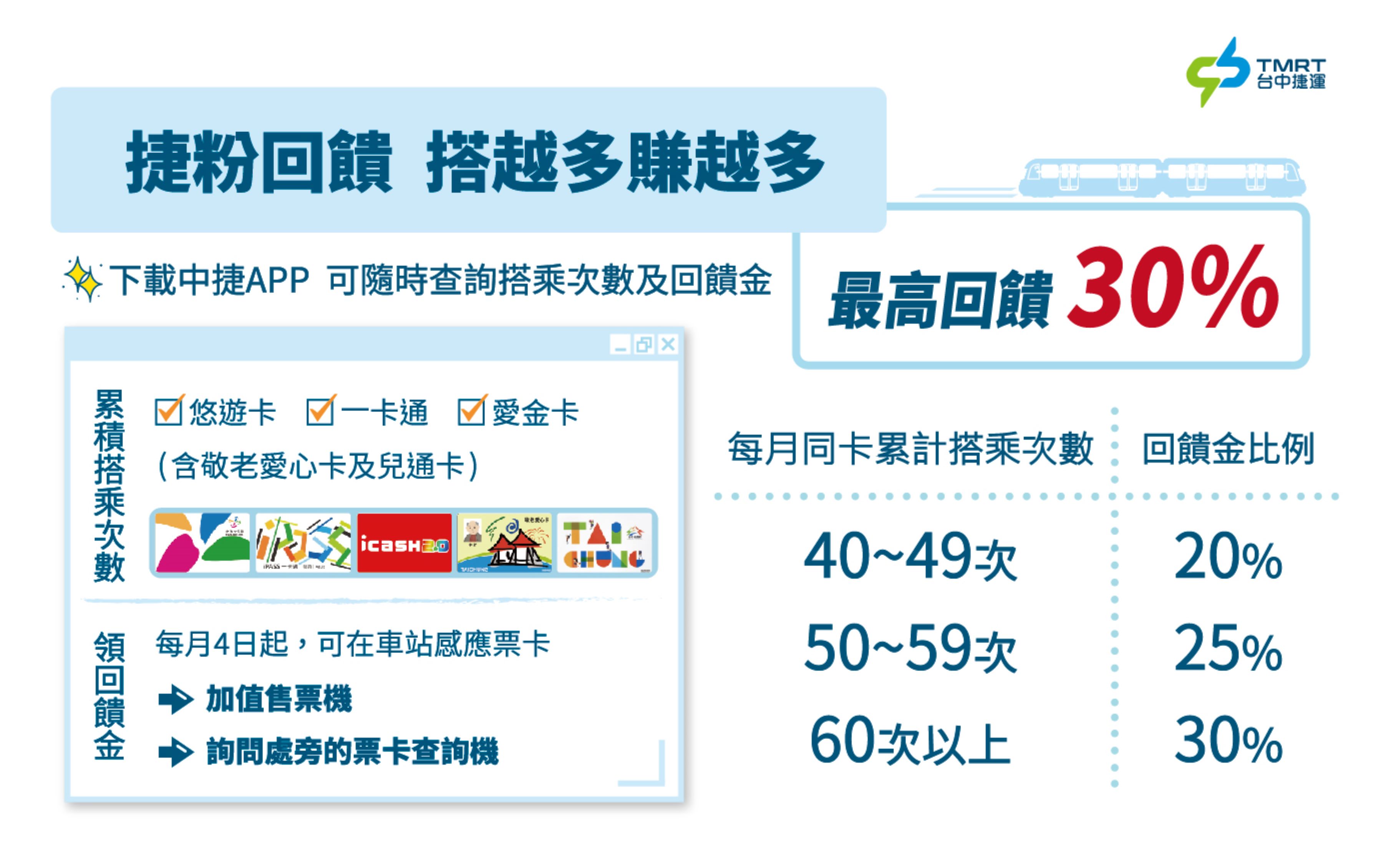 中捷公司指出,配合捷粉回饋專案推出,9月1日起台中捷運app也全新改版,旅客下載中捷app並綁定使用的電子票證卡號,就可隨時查詢搭乘次數及可回饋金額。除現金回饋、搭越多回饋越多之外,中捷公司還會陸續推出更多捷粉好康,詳細內容可參見臺中捷運官網(https://www.tmrt.com.tw/)、台中捷運APP,並加入FB台中捷運粉好康社團,隨時掌握好康情報。
