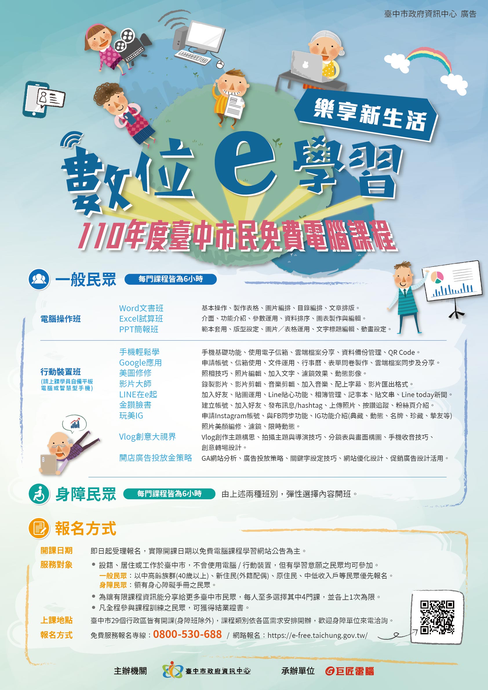 市民免費電腦課程即日起報名,課後上傳心得感想與作品,大獎平板等你抽!配合新冠肺炎疫情警戒措施延期的「市民免費電腦課程」將於9月份起正式開課,並於今(25)日起受理報名,凡是40歲以上,設籍、居住或工作於台中市,以及新住民、原住民、中低收入戶與身障人士等民眾優先錄取,千萬別錯過!