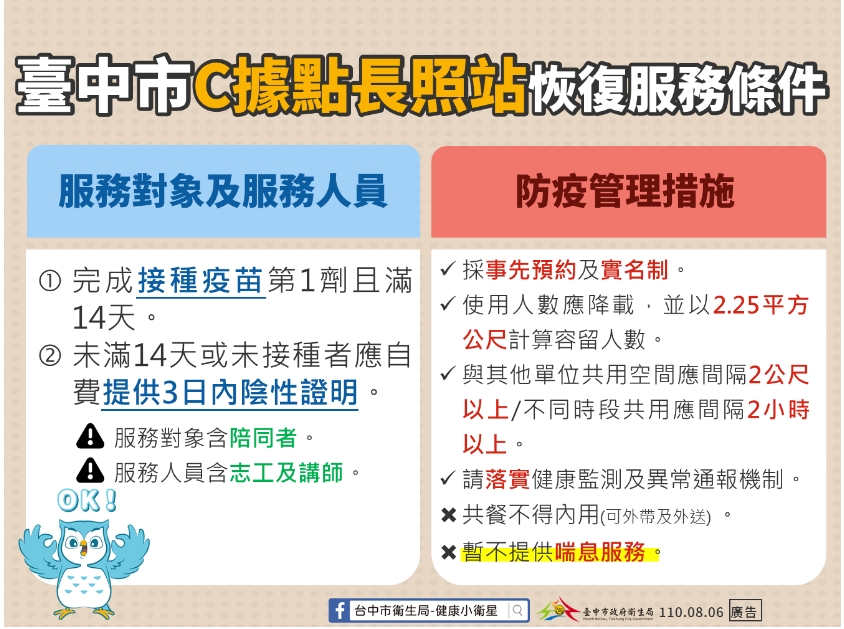 此外,台中市C據點長照站自8月6日起,也陸續輔導全市103家據點有條件恢復服務。除參加據點活動的長輩及工作人員須依規完成第一劑疫苗接種且滿14日或自費篩檢外,對於活動空間規劃,使用人數應降載,以每人2.25平方公尺計算容留人數,且暫不提供喘息服務,餐飲不開放內用,改採餐盒外帶或外送服務。