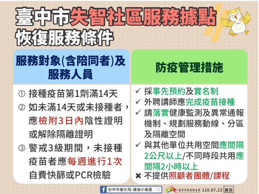 考量失智服務對象及家庭照顧者需求,台中市依據衛生福利部於今年7月22日訂定「失智社區服務據點因應COVID-19防疫管理指引」有條件恢復服務,凡參加據點活動的長輩及工作人員都應接種疫苗第一劑且滿14日,未接種疫苗或接種第一劑疫苗未滿14日者,首次提供或接受服務前,須自費提供3日內快篩或PCR陰性證明,以維護長輩及工作人員健康;餐飲服務則採分批用餐,以梅花座或使用隔板保持社交距離。