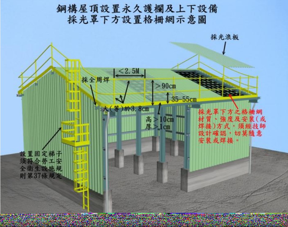 台中市勞動檢查處說明,如在易踏穿的材料所構成的屋頂從事作業時,應設置具有適當強度且寬度30公分以上的踏板,同時使用背負式安全帶、安全帽及其它必要防護具,且安全帶應確實掛置於安全母索上,並於屋頂設置安全網、堅固格柵等防墜措施。