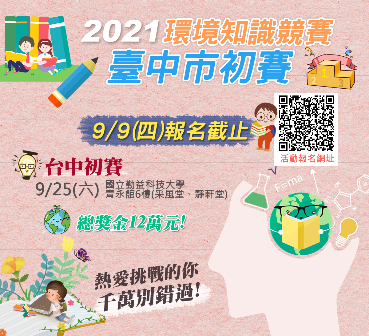 台中市政府為推廣環境知識,增進各級學校師生及民眾對於環境保護的認知與瞭解,環境保護局將於9月25日,於國立勤益科技大學舉辦環境知識競賽初賽,分為國小組、國中組、高中(職)組及社會組四組,活動報名將於9月9日截止,歡迎台中市有興趣學生及民眾踴躍報名。