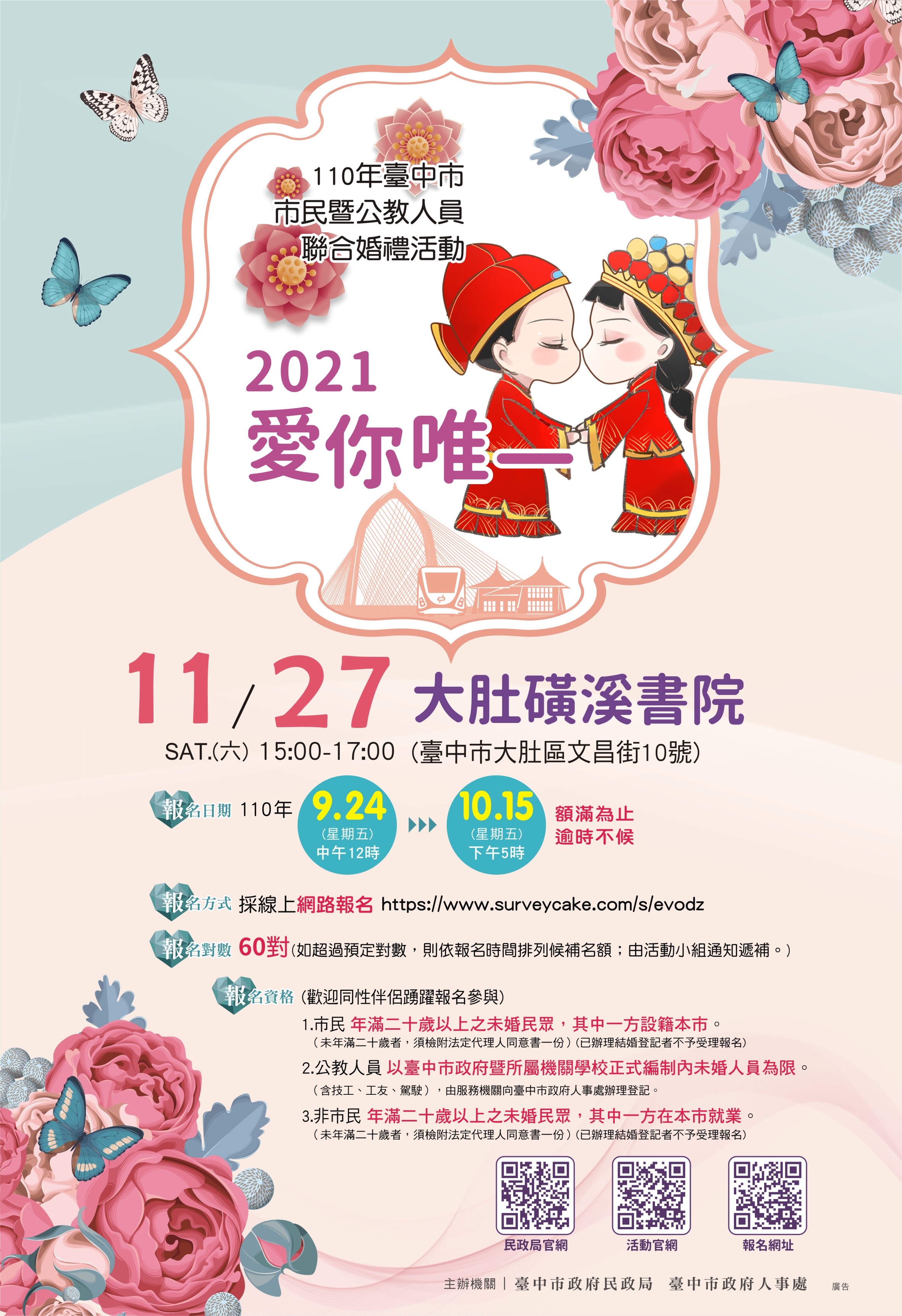 感受古色古香百年書院及幸福氛圍,110年台中市市民與公教人員聯合婚禮1127日將在大肚「磺溪書院」舉辦,今年因應防疫僅開放60對參加,並接受市長盧秀燕證婚。活動更將贈送新人小家電及金鏟子等多樣好禮增添祝福。民政局長吳世瑋表示,924日中午12時起至1015日下午5時止開放線上報名,歡迎新人一同體驗古式婚禮,留下一生一次的專屬回憶。