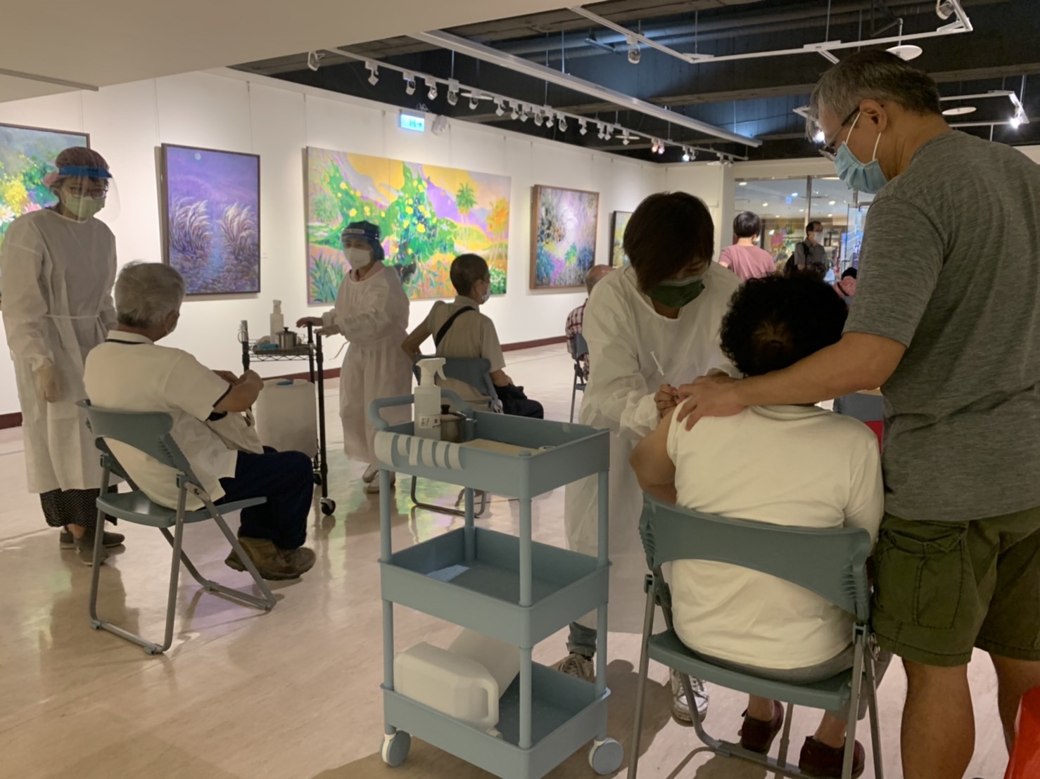 吳局長指出,台中市西區是匯集歷史、文化、宗教、產業的重要地點,轄內學校、文化設施眾多,有著「台中市文教區」的美稱,西區公所為提供市民大空間、動線好、有空調的接種場所,便向「大墩文化中心」洽借1樓藝文走廊第567展區,在不影響文化中心日常營運下,提供民眾舒適的接種環境,讓民眾接種疫苗兼賞藝文展覽;此外,位於太平區的「屯區藝文中心」也出借1樓演藝廳,協助太平區公所疫苗接種服務,讓民眾接種疫苗後,享受藝文美學的愜意空間。