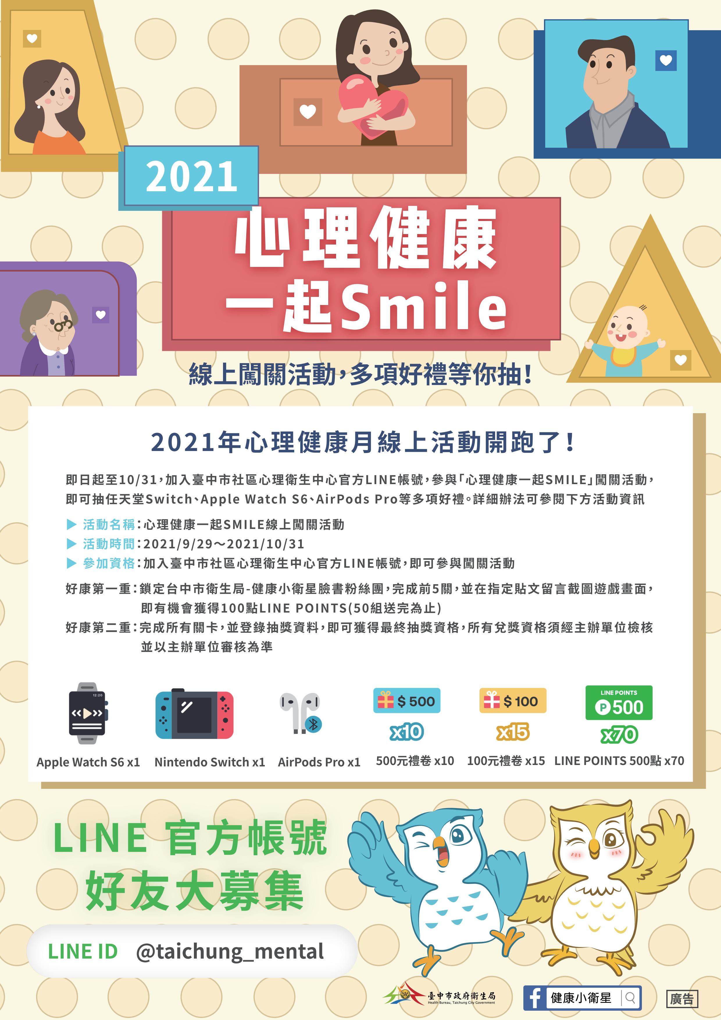 今年心理健康月特別辦理線上心理健康互動集點遊戲及抽獎活動,凡透過線上報名講座及影展的民眾,於活動結束後,透過QR Code可取得SMILE地圖點數1點,並加入台中市社區心理衛生中心官方LINE帳號(@taichung_mental),完成指定任務即可獲得限量精美禮品。此外,還可參加抽獎活動,最大獎有Apple Watch Series 6、Nintendo Switch及AirPods Pro等獎品。