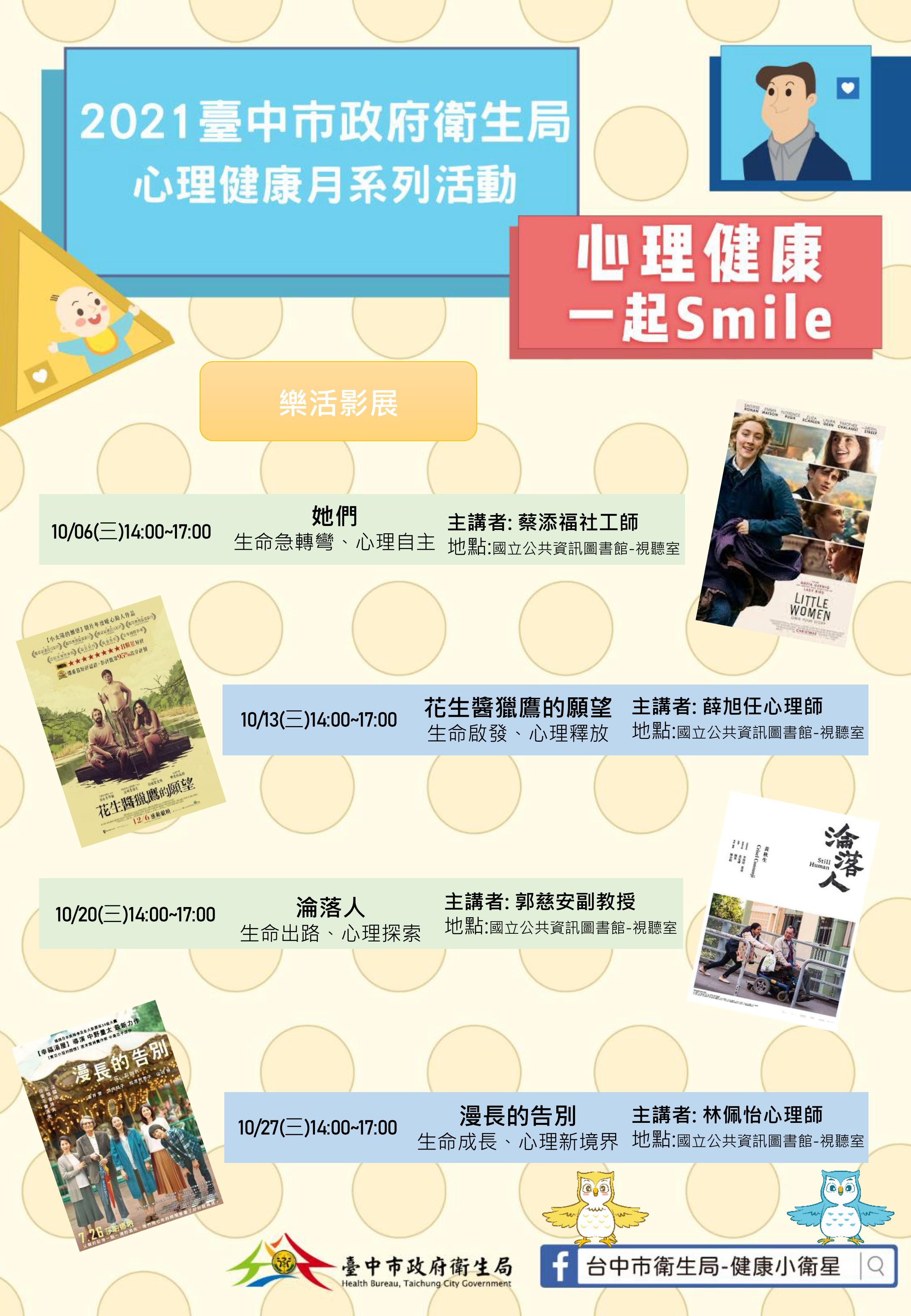 10月10日是世界心理健康日,為因應民眾受到新冠肺炎疫情影響,恐產生的心理健康問題,台中市政府衛生局10月以「心理健康一起SMILE」為主題,於國立公共資訊圖書館、大墩文化中心、維他露基金會舉辦10場不同主題心理健康講座及4場影展,內容多元,包括探索成年親子關係修復、網路霸凌、職場生活等層面的心理議題,歡迎民眾踴躍報名參加。