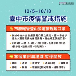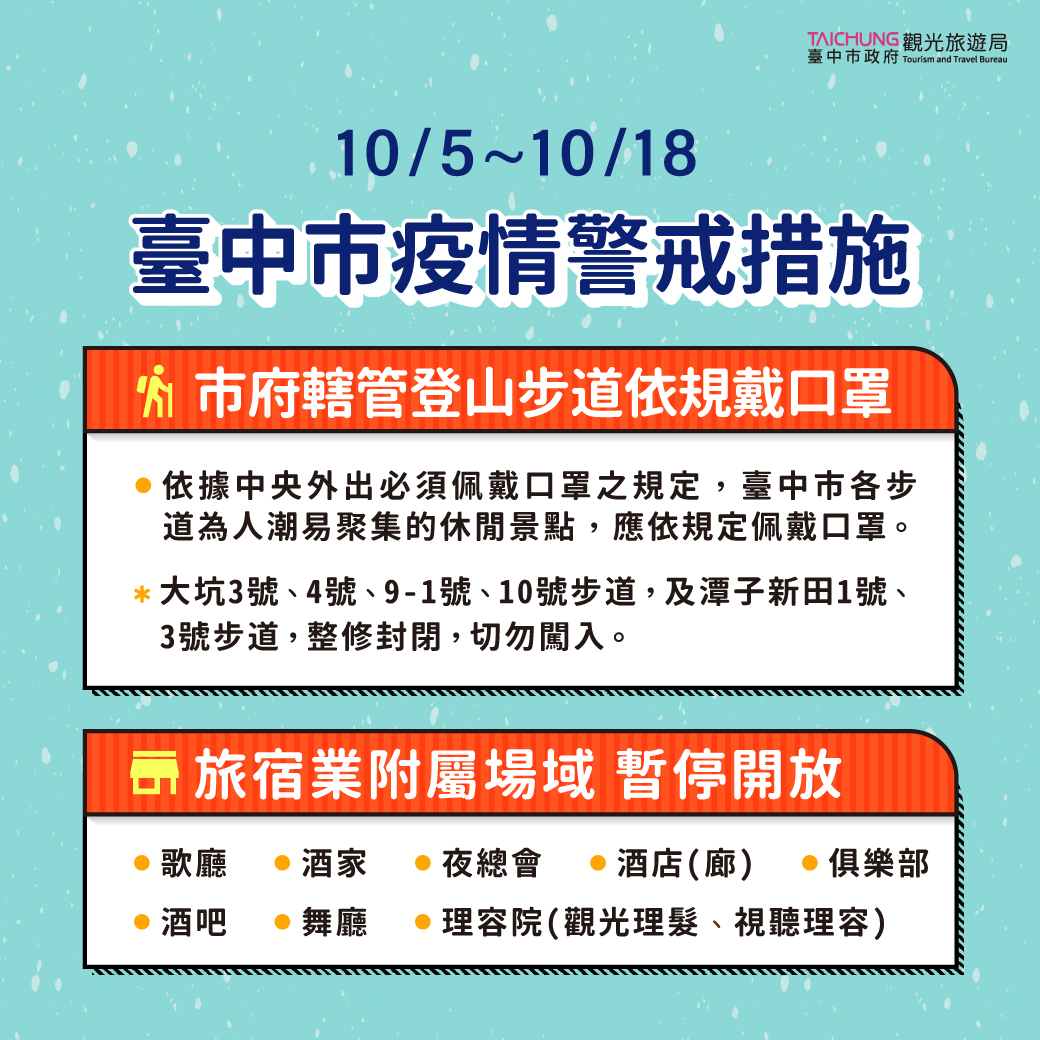 觀旅局呼籲,中市權管登山步道人潮眾多,為確保登山民眾健康安全,民眾登山仍須佩戴口罩;另今日起,大安濱海樂園(含沙灘區)活動也請民眾依循中央防疫指引,隨身攜帶口罩,若無法保持社交距離則應佩戴口罩。出遊時遵守各項防疫規定與措施,勤洗手、保持社交距離,共同維護你我安全。(10/5*8)*觀光旅遊局