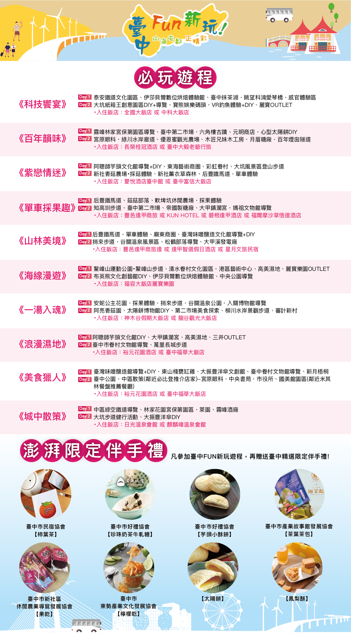 觀旅局說明,為振興台中觀光旅遊市場,特別整合觀光相關公協會團體、旅行業者及在地商家業者等資源,Fun新玩遊程以「主題式活動」及「套裝式遊程」兩大亮點為核心,推廣台中「山、海、屯、都」區域為目標,精心推出10條專屬創新體驗遊程二日遊,每條遊程皆精心安排專業導覽服務及特色體驗活動,結合科技饗宴、單車採果、山林美境、一湯入魂等多元主題,吃喝玩樂樣樣齊全。