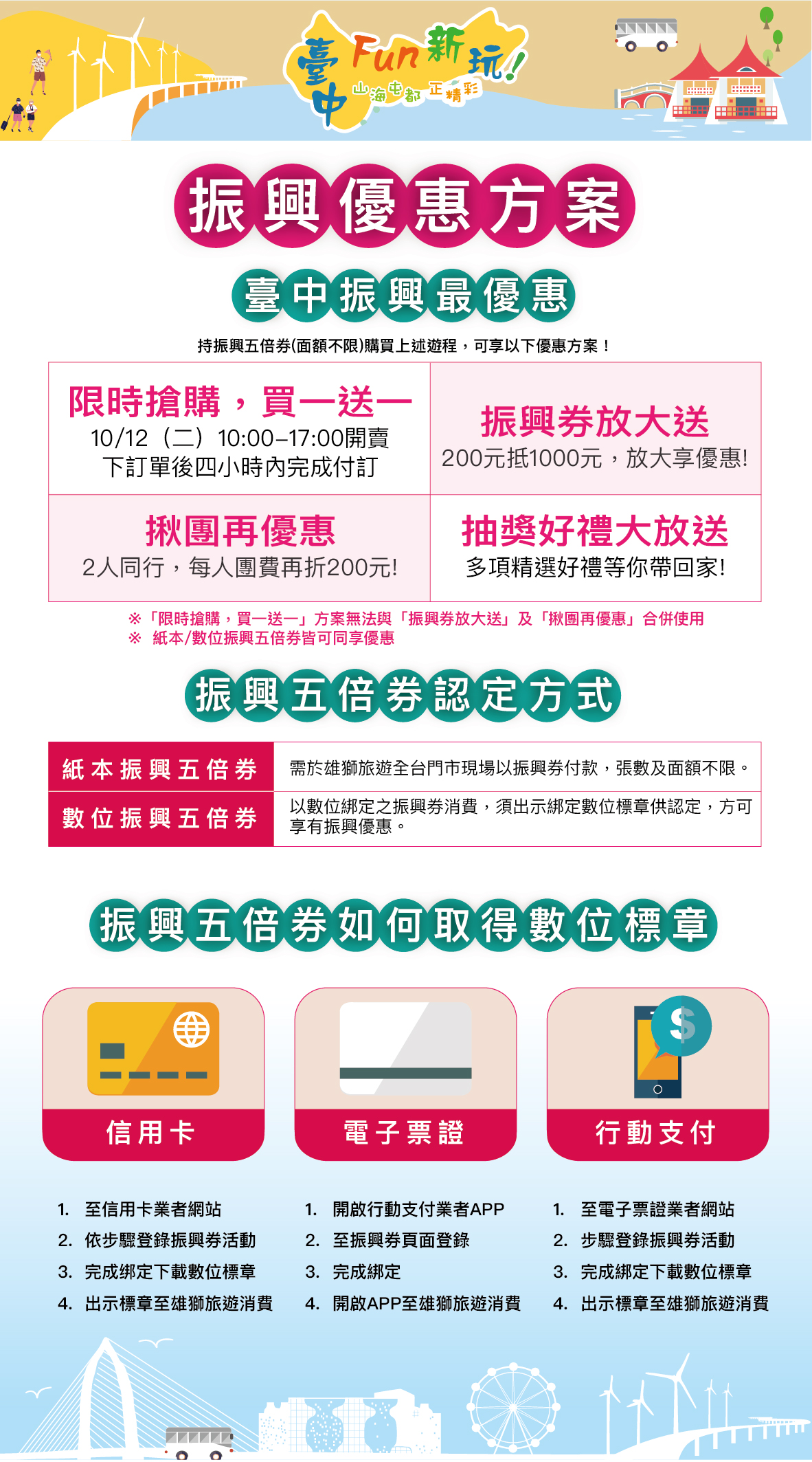 觀旅局長韓育琪表示,在10月12日活動開賣第一天,持振興券購買遊程即享買一送一限時優惠,活動時間持振興券購買遊程,不限振興券使用面額,每套遊程可折抵團費新台幣1,000元、揪團雙人成行再享每人優惠新台幣200元,12月25日前報名訂購遊程還可參加抽獎活動;此外再搭配10月10日至12月9日為期兩個月的購物節活動,到台中觀光旅遊絕對是首選。