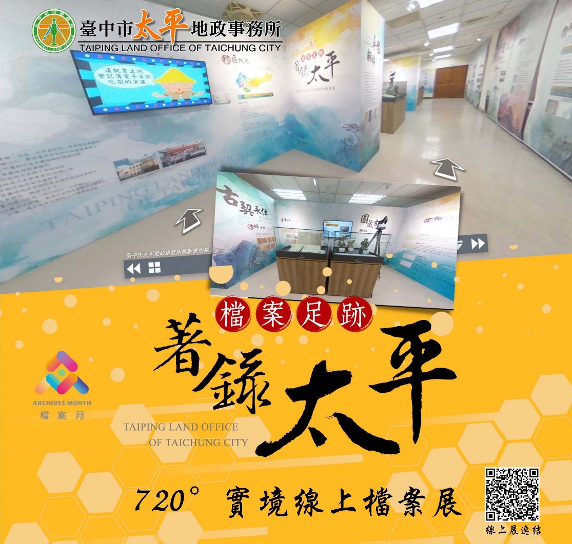 配合國家發展委員會檔案管理局110年檔案月串聯活動,台中市太平地政事務所即日起推出「檔案足跡.著錄太平720度實境線上檔案展」,展覽突破疫情及空間的限制,結合網路及攝影技術,以實境線上導覽方式展出;分為3大主題,包含雲端環景導覽地政文物、太平城市走廊新亮點、「跨時代契跡-台灣的古書契」與「枇杷阿伯的起家厝」電子書等,提供民眾多元化的檔案知識。