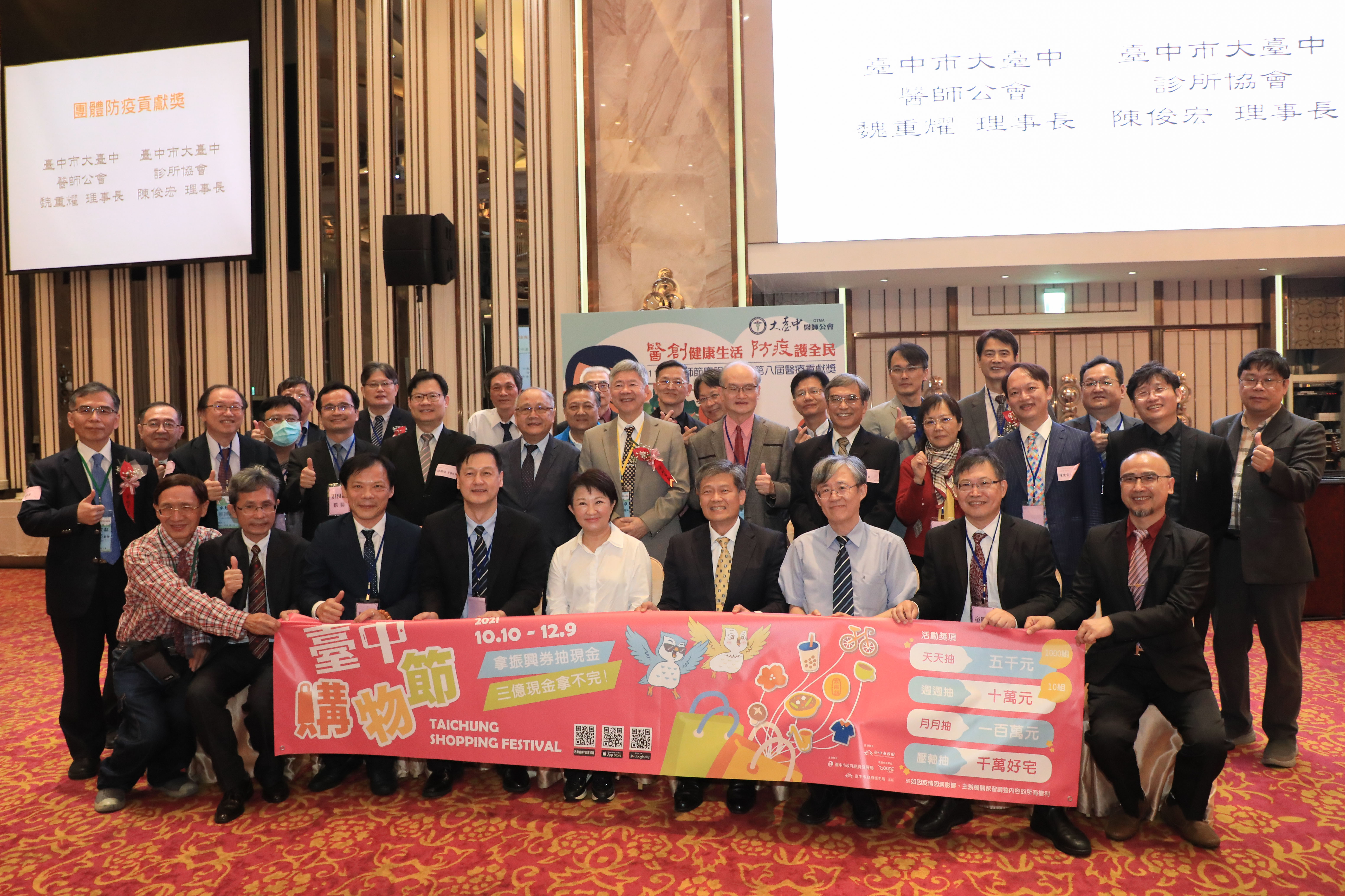 11月12日為一年一度的醫師節,為感謝台中市醫療院所於疫情期間不辭辛勞、犧牲奉獻,台中市醫師公會及台中市大台中醫師公會今(21)日辦理醫療奉獻獎及醫療貢獻獎頒獎典禮,頒發今年度協助防疫工作、疫苗接種及社區快篩等衛生業務醫療院所及醫師感謝狀,市長盧秀燕到場感謝醫護人員,「有大家真好!」她表示,市府將與醫界攜手同心,維護市民安全。
