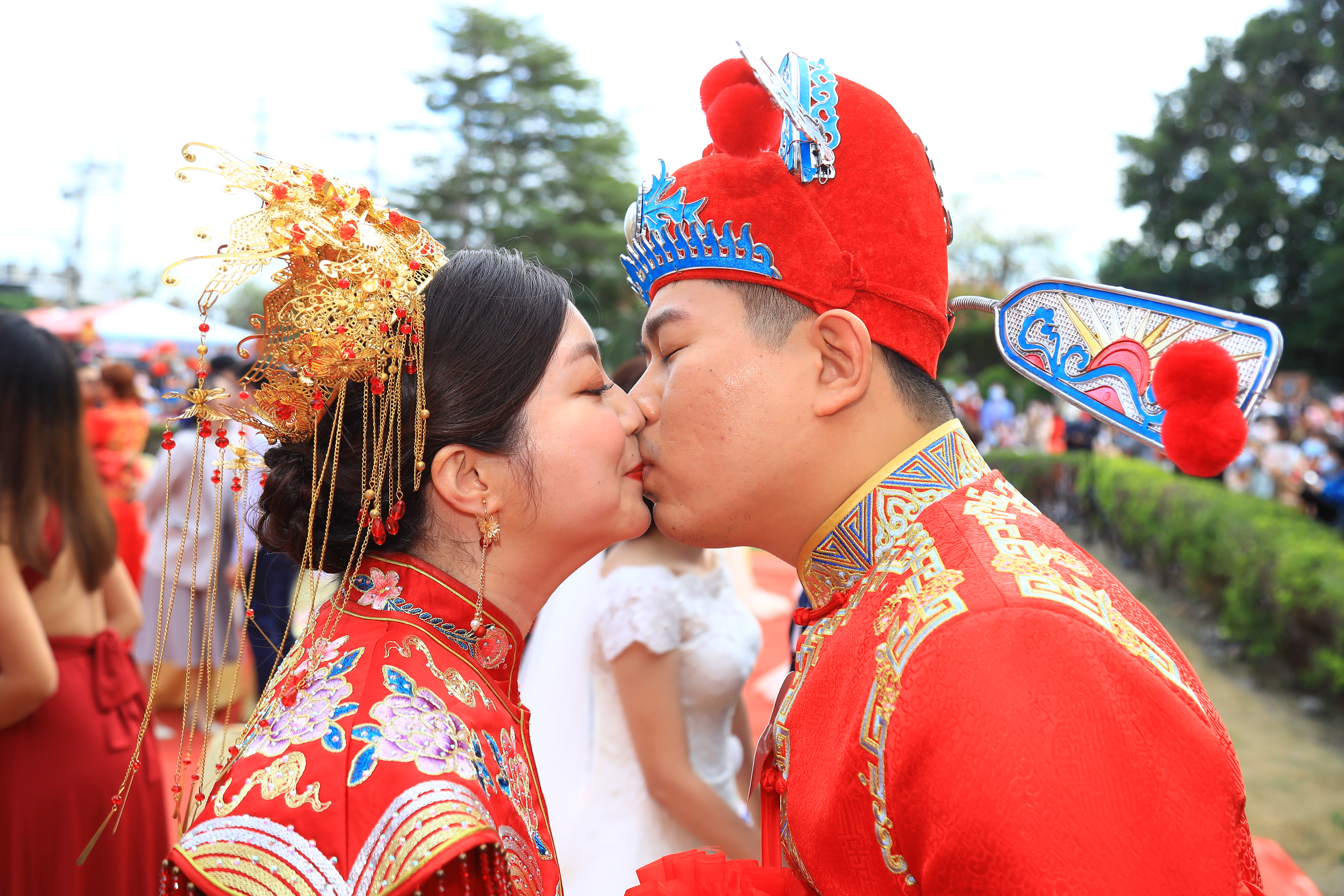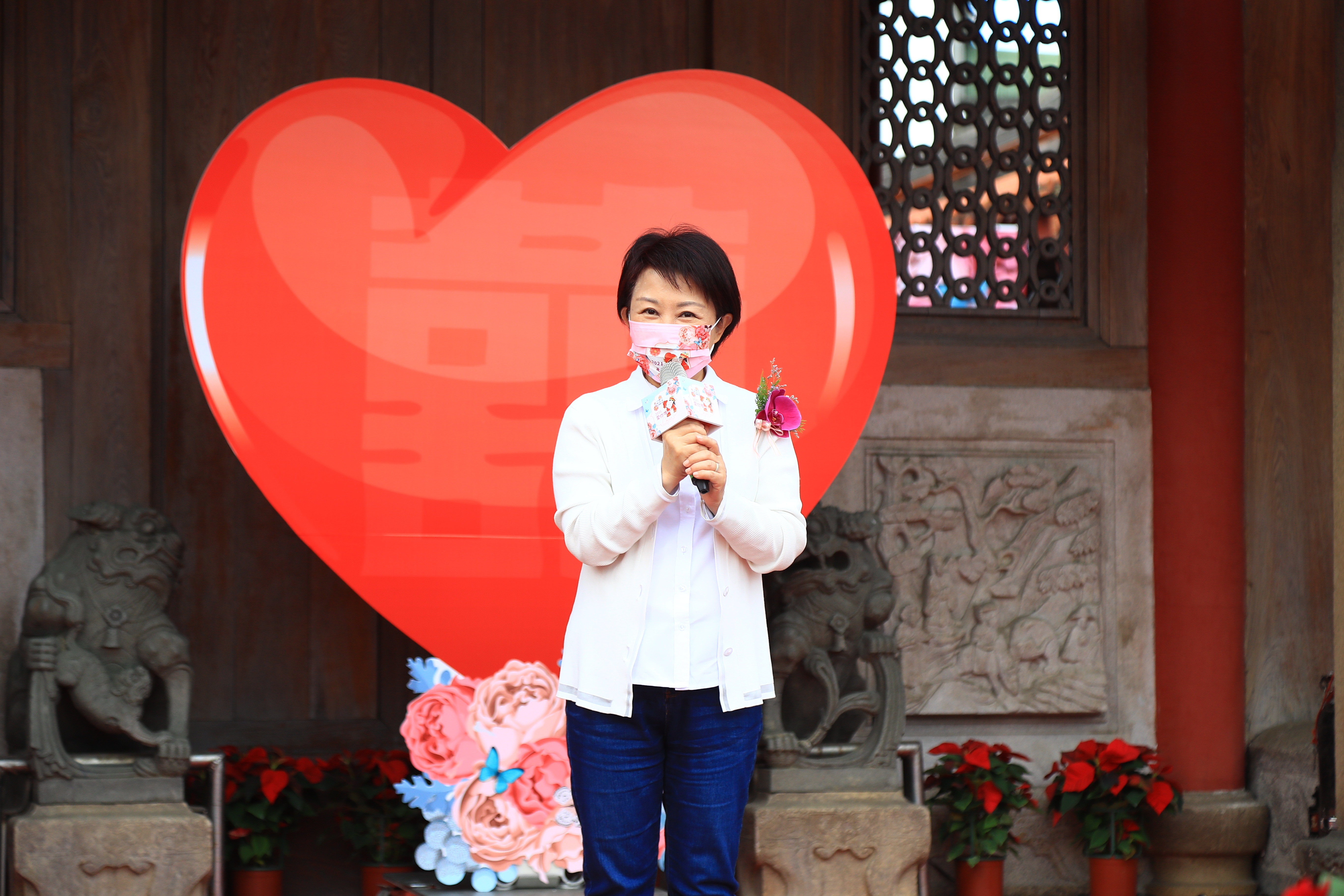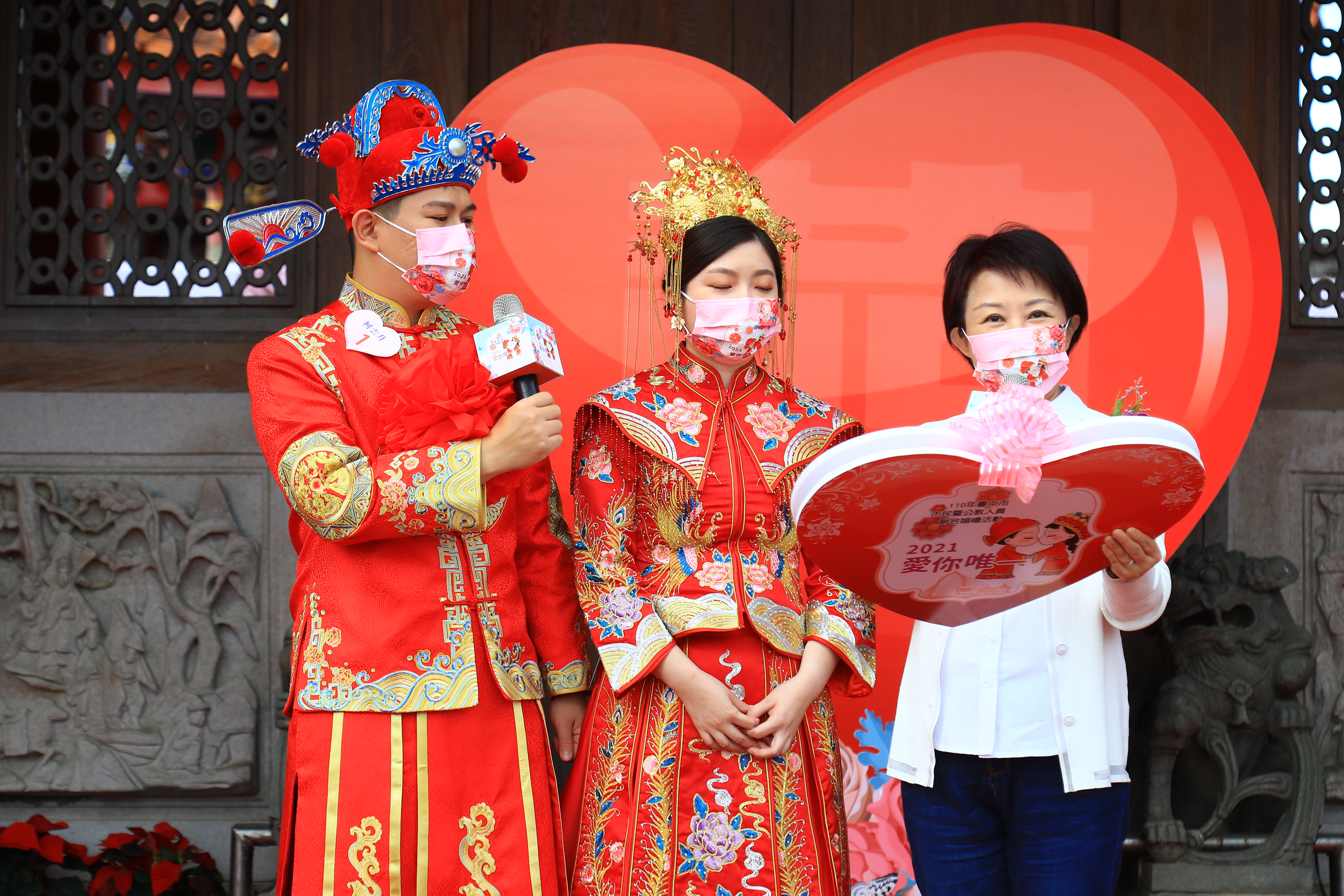 110年台中市市民暨公教人員聯合婚禮今(27)日在大肚「磺溪書院」舉行,以古式婚禮為主題,60對新人精心裝扮,搭配白馬與花轎進場,結合百年書院古色古香氛圍,讓新人留下難忘回憶。市長盧秀燕以主婚人身分出席,帶領新人宣讀結婚宣言,也提醒因為愛「莫忘初衷」,市府結合活動在地地名「大肚」,祝福新人「大肚成功」早生貴子,為台中市注入生力軍。