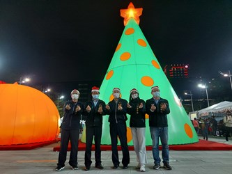 2021台中好聖誕」昨(19)晚於台灣大道府前廣場溫馨點燈,展期至1224日。副市長黃國榮代表市長盧秀燕與現場大小朋友一同倒數,攜手點亮象徵「予愛同在」的八米高充氣雕塑聖誕樹,及台中在地原創角色藝行公仔誠實君「阿尼斯特」主燈,共同為城市禱告平安與祝福,提前預祝聖誕節快樂。