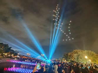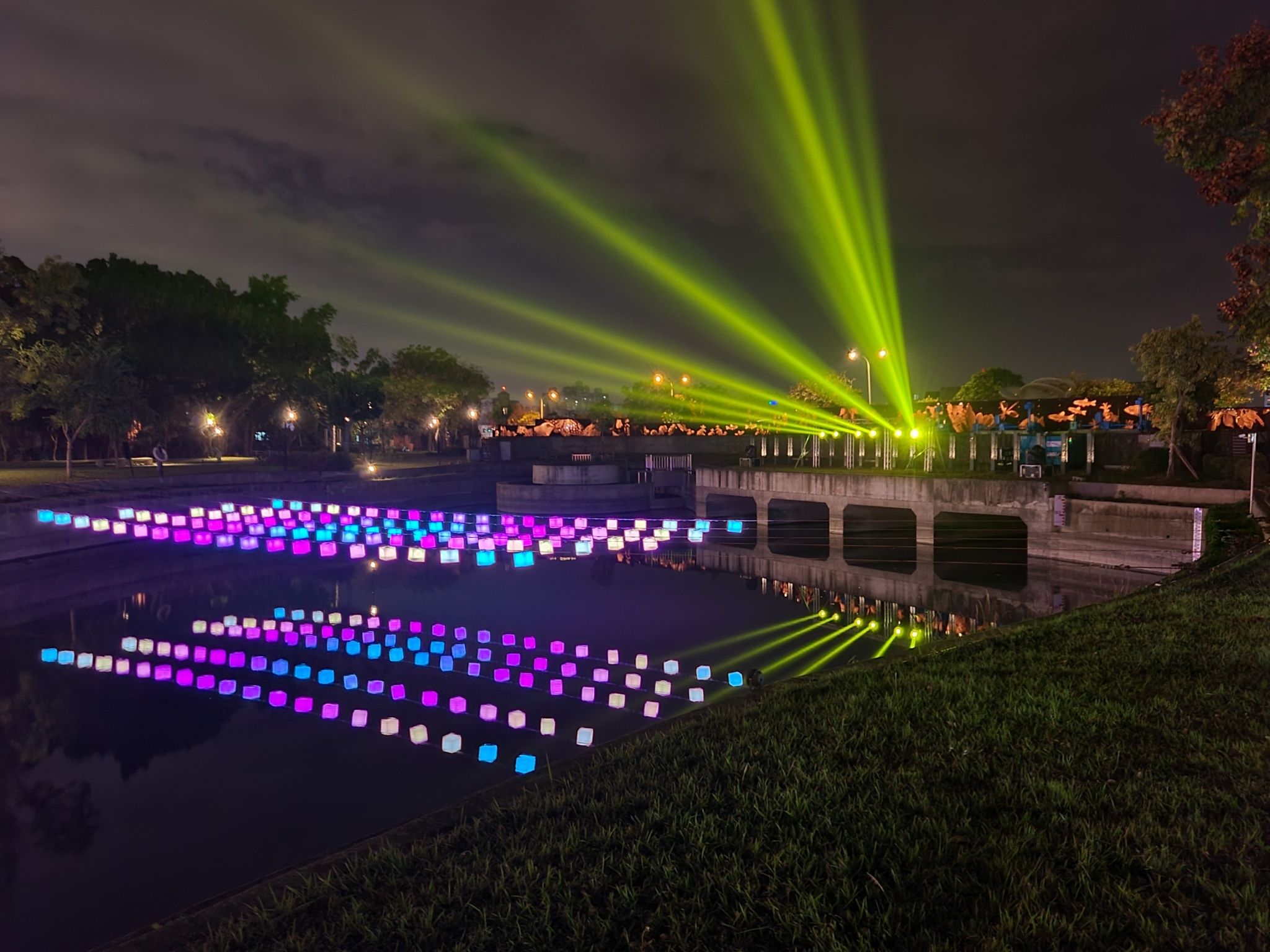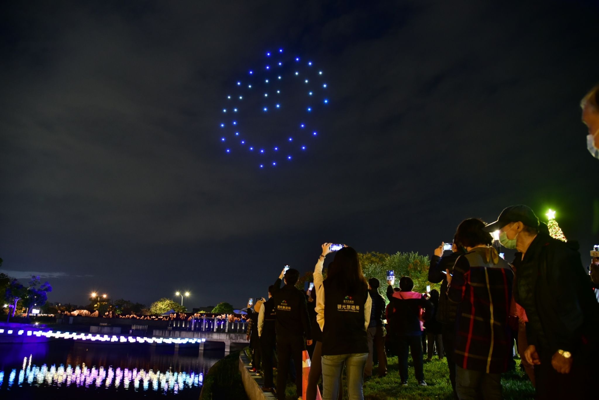 台中耶誕節精彩活動一檔接一檔,繼日前於石岡登場的山城花漾藝術燈節點亮台中市之後,「金色葫蘆墩」光藝術展演也於今(24)晚聖誕夜正式閃耀登場!今日開幕儀式以精彩無人機展演「生命的色彩」揭序,此作品曾榮獲MUSE鉑金獎及DRIVEN x DESIGN紐約設計大獎銀獎,透過首次規劃無人機於葫蘆墩公園第五區軟埤仔溪水面展演,結合燦爛奪目的水面燈光及音樂的躍動,讓欣賞的民眾大呼過癮。副市長令狐榮達也出席開幕式,與民眾歡度平安夜。