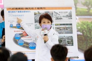 盧市長說,她時任民意代表時即積極爭取地下道填平建設,並已於上任後完成4處地下道填平作業,分別為北屯區太原路、豐原區圓環北路、東區建成路及西、南區五權路,去年3月接續辦理最後1處、也是最大的國光路地下道填平工程,原定於去年底開放全線通車、今年上半年完工,已提前約1.5個月,於去年11月15日先行開放國光路及建國南北路三線通車,更於今日提前完工。
