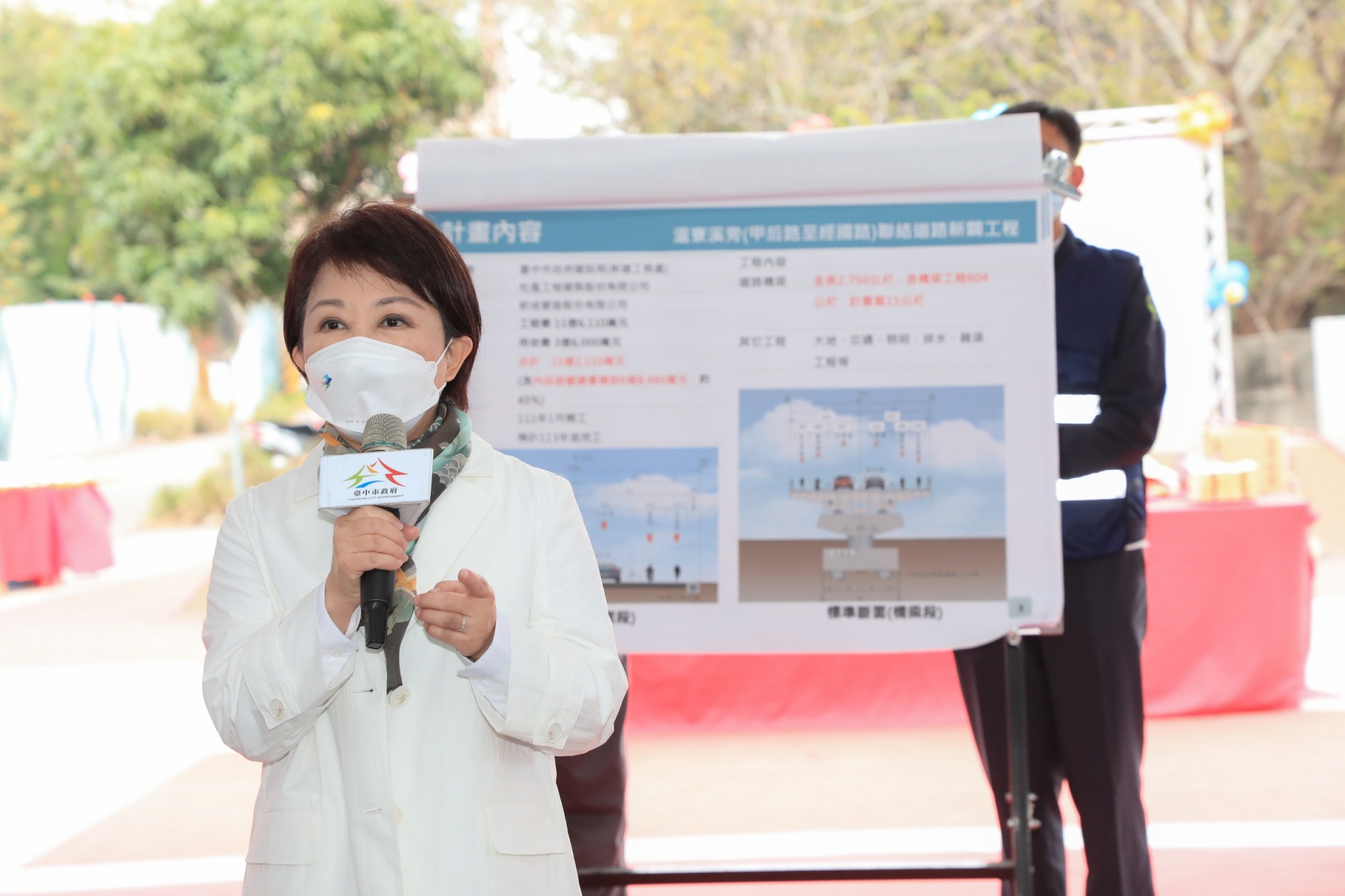 「送給大甲、外埔最好的農曆新年禮物!」盧市長表示,大甲、外埔地區主要聯外道路甲后路車流量大、經常塞車,地方居民1、20年來殷殷期盼再增加一條聯外道路,由於新闢工程經費龐大,多年來無法開工,她上任後逐步編列預算、爭取補助、確認路線並發包,雖受疫情及大宗物資劇烈波動影響,歷經6次流標及調整預算,但已於去年底發包成功,完工後將大幅降低大甲、外埔地區塞車情形。