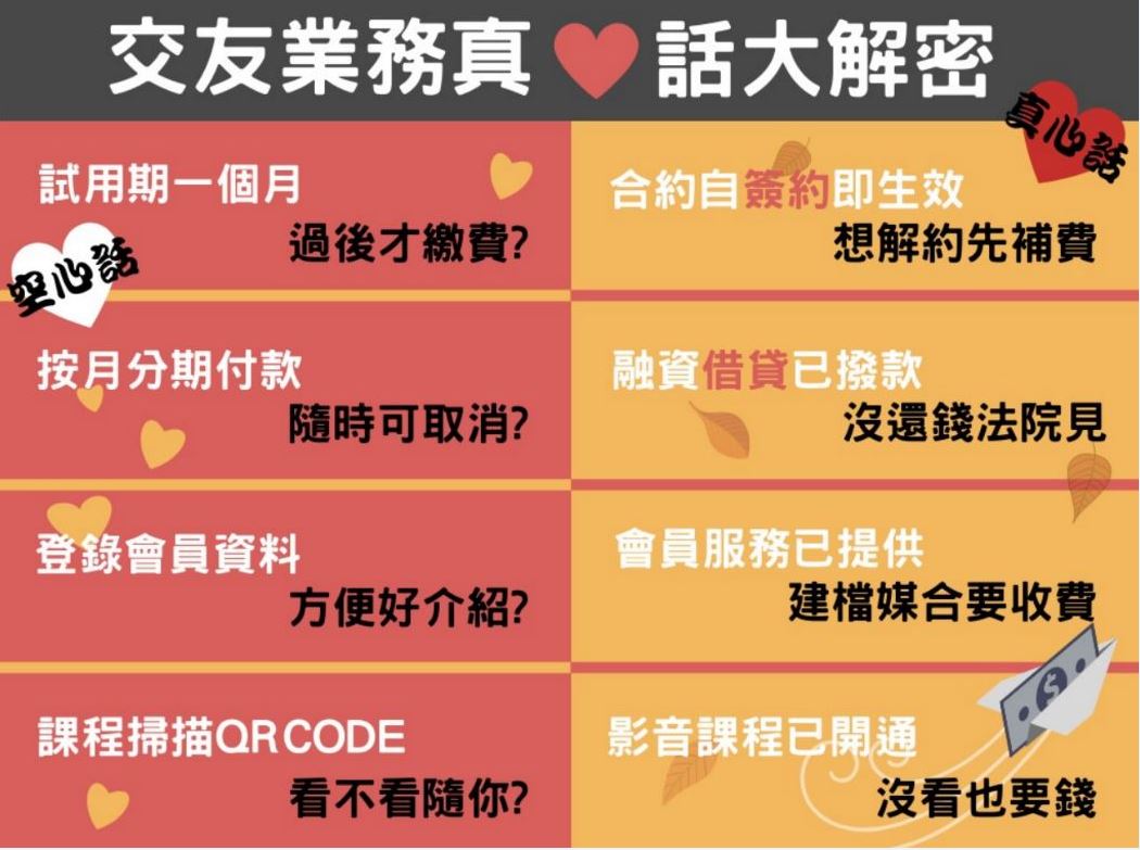 臺中市消保官何怡萱說明,此類申訴案件,部分業者是透過女性業務員在交友軟體上尋找目標,主動噓寒問暖,藉由聊天,探詢目標對象的工作及感情狀況,再相約見面。見面後,就引領消費者進入公司營業處所,誘導推銷簽訂高價的聯誼服務契約。若消費者表示資力不足,業者就宣稱可提供分期付款,令消費者在未及深思熟慮的情況下,倉促簽約後,才知道所謂「分期付款」,事實上是向資融公司借款以支付服務費。消保官提醒消費者,業者這種銷售模式,可能已構成消費者保護法所稱的「訪問交易」,消費者得於簽約後7日內,儘速寄存證信函通知業者解除契約,並拒絕資融公司撥款。如有爭議,可善用消費申訴程序,以維護自身權益。