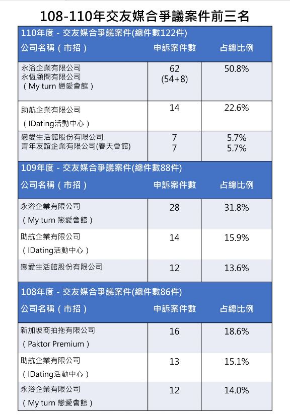臺中市政府法制局局長李善植表示,110年受理交友聯誼服務申訴案件中,件數最多的業者為「My turn戀愛會館」62件(永浴企業有限公司、永恆顧問有限公司),其次為「IDATING活動中心」14件(助航企業有限公司)。經調查,每起爭議案件的金額,平均年費都要4萬元以上,尤其,助航公司(IDATING活動中心)的申訴案件,更有5件個案爭議金額皆達30萬元,造成消費者荷包大失血。
