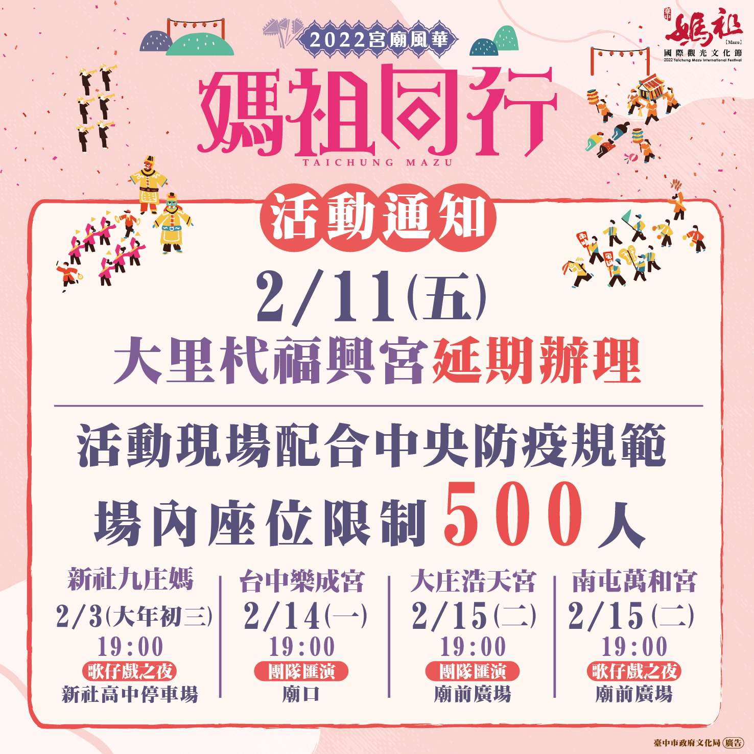 文化局表示,後續尚有大里杙福興宮、豐原慈濟宮、社口萬興宮、北屯南興宮、台中萬春宮、梧棲朝元宮及大肚萬興宮等宮廟將舉辦藝文匯演。為配合中央流行疫情指揮中心防疫規範,各場次活動皆設置出入口控管人流500人以內,座位安排室外保持1公尺社交距離,並請入場民眾配合實聯制、量測體溫、手部酒精消毒及全程佩戴口罩。有關活動詳情請上台中市政府文化局網站( https://www.culture.taichung.gov.tw/ )查詢。(2/9*15)*文化局