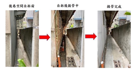 水利局表示,在執行用戶接管工程期間,少數住戶不願配合退縮屋後空間,嚴重影響他人權益及環境衛生改善,水利局依規通報都發局執行違建查報及排訂拆除後,再由水利局的施工廠商接著進場施作污水接管工程,並在市府原定改善期限內,完成用戶接管,民眾表示自拆後巷及污水接管工程,實際施作工期不到一週即完成,對生活影響已減至最小,市府將持續努力使環境整潔提升;另外亦利用疫情期間一中街人流大幅減少,積極加速該區的污水接管,將原本最為困難執行的一中商圈污水接管在影響商家營業最少的情況下完成。