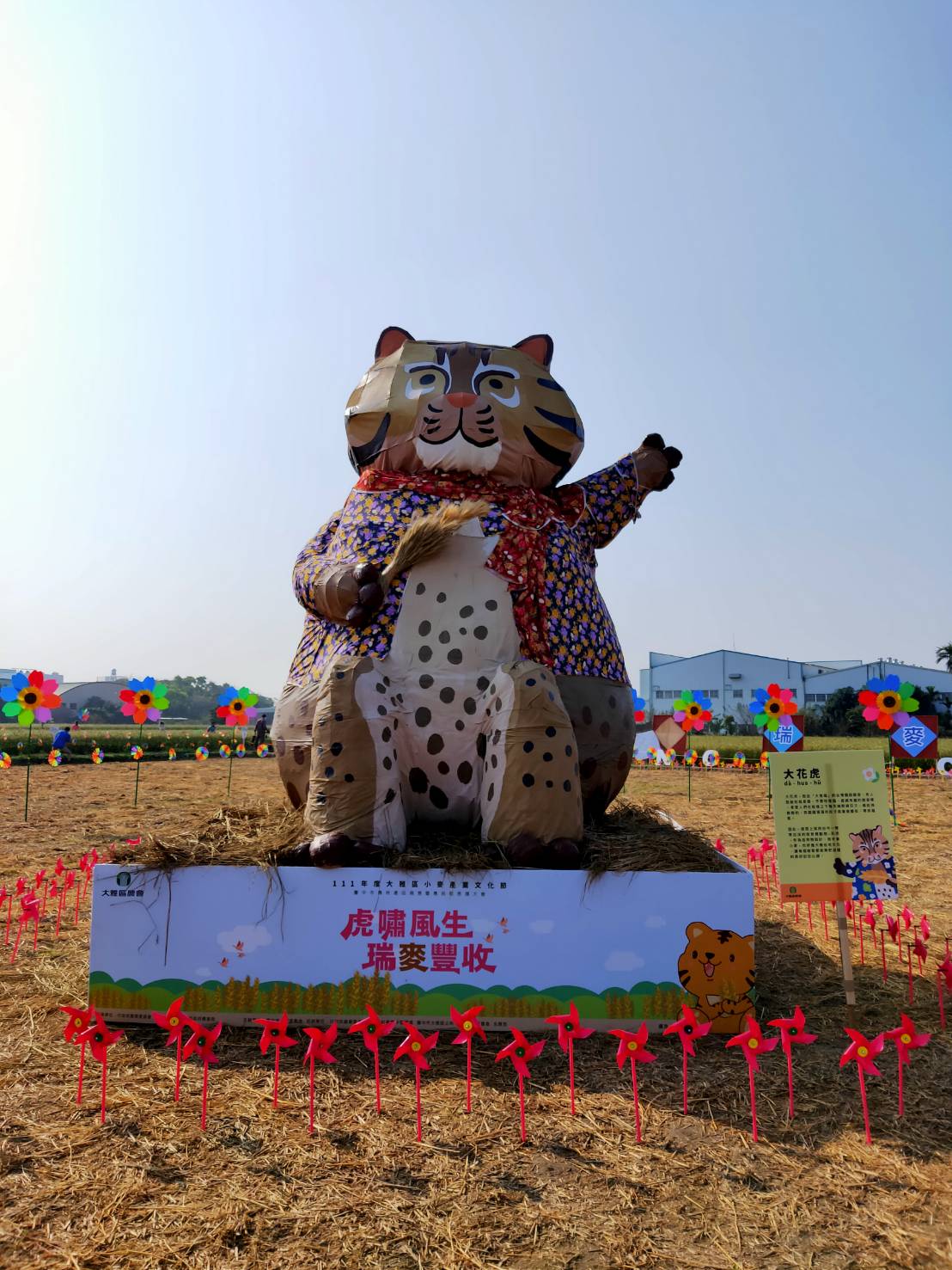 台中市政府農業局輔導大雅區農會今(5)日於大雅區員林里寶興宮前廣場前舉辦111年度大雅區小麥產業文化節,以「虎嘯風生·瑞麥豐收」為主題,設置大花虎麥田裝置藝術,可愛吸睛,也安排尋寶、農特產品展售、節目表演等活動,吸引許多民眾共襄盛舉。