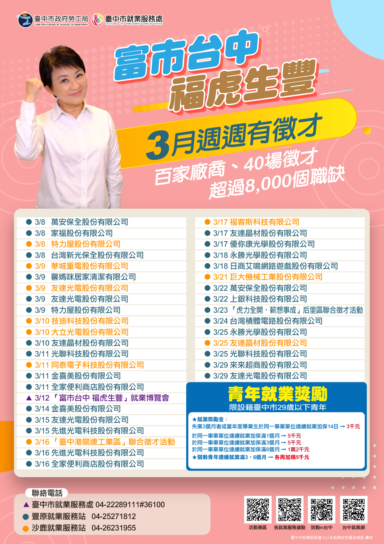 勞工局說明,台積電於中科園區籌設新廠、廣招人才,市府除了邀請台積電參與312日於中興大學辦理之「富市台中 福虎生豐」就業博覽會外,324日也合作在中科辦理客製化徵才活動,預計釋出1,000個薪資上看6萬元職缺。另外,也邀集上銀科技、友達光電、巨大機械及矽品精密等100家廠商,釋出8,000個就業機會,其中漢鐘精機及妙印精機均開出6萬元高薪。