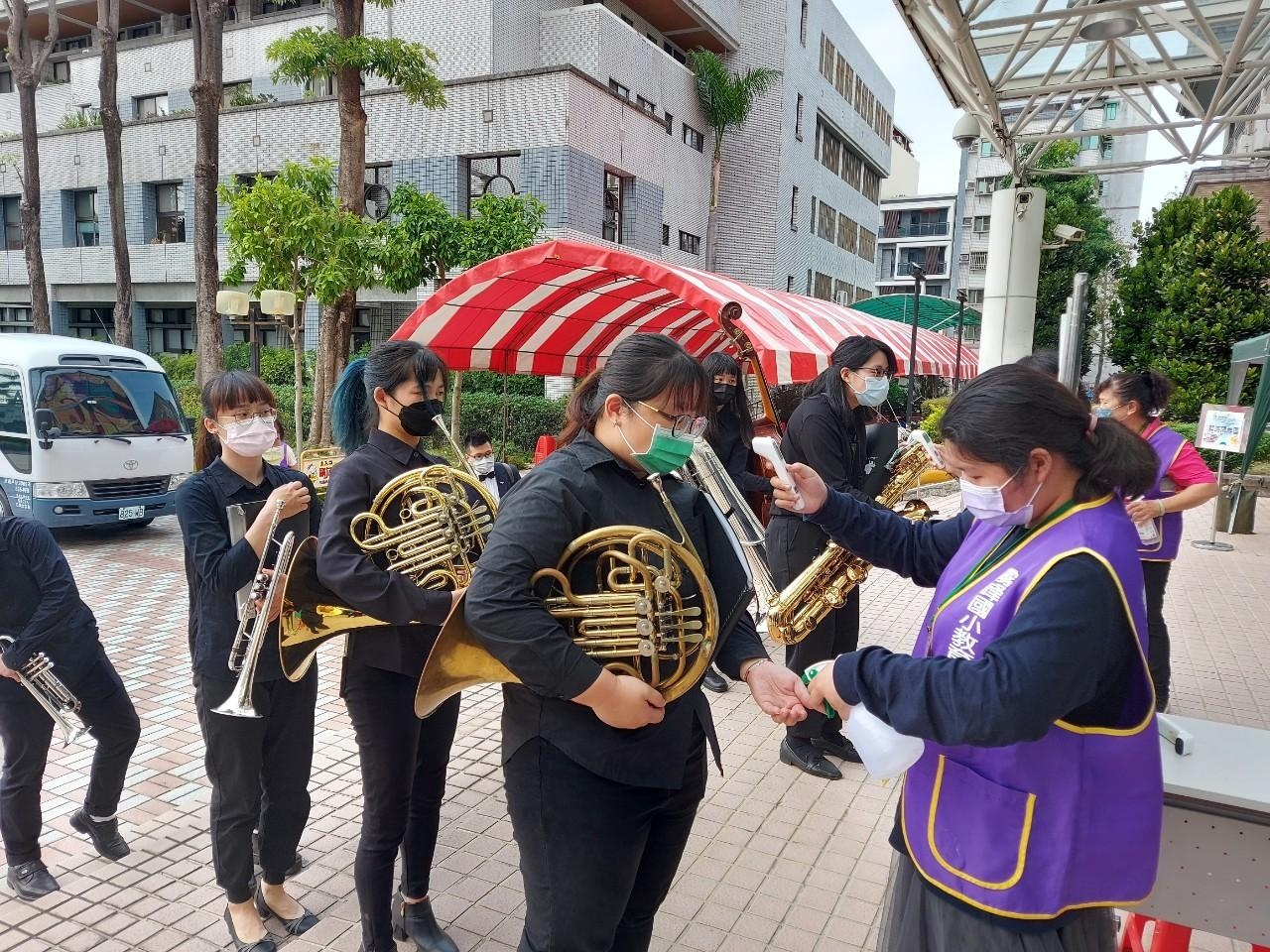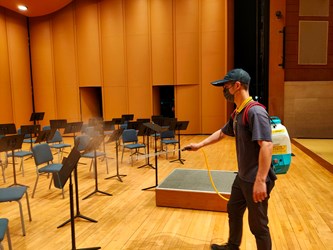 楊局長指出,賽前各場地承辦學校教職員工及志工們積極佈置會場,工作至夜幕低垂;比賽當日早上7點30分,承辦及協辦學校校長即帶領各校工作人員於各比賽場館就定位迎接比賽團隊,競賽場地調音區、休息區、準備區、廁所、舞台,處處可見防疫清消人員進行消毒工作,舉凡手會碰觸的椅子、門把及廁所等,都以高規格防疫措施落實防疫。