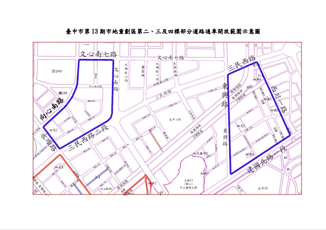 台中市第 13 期市地重劃區第二、三及四標部分道路通車開放範圍示意圖