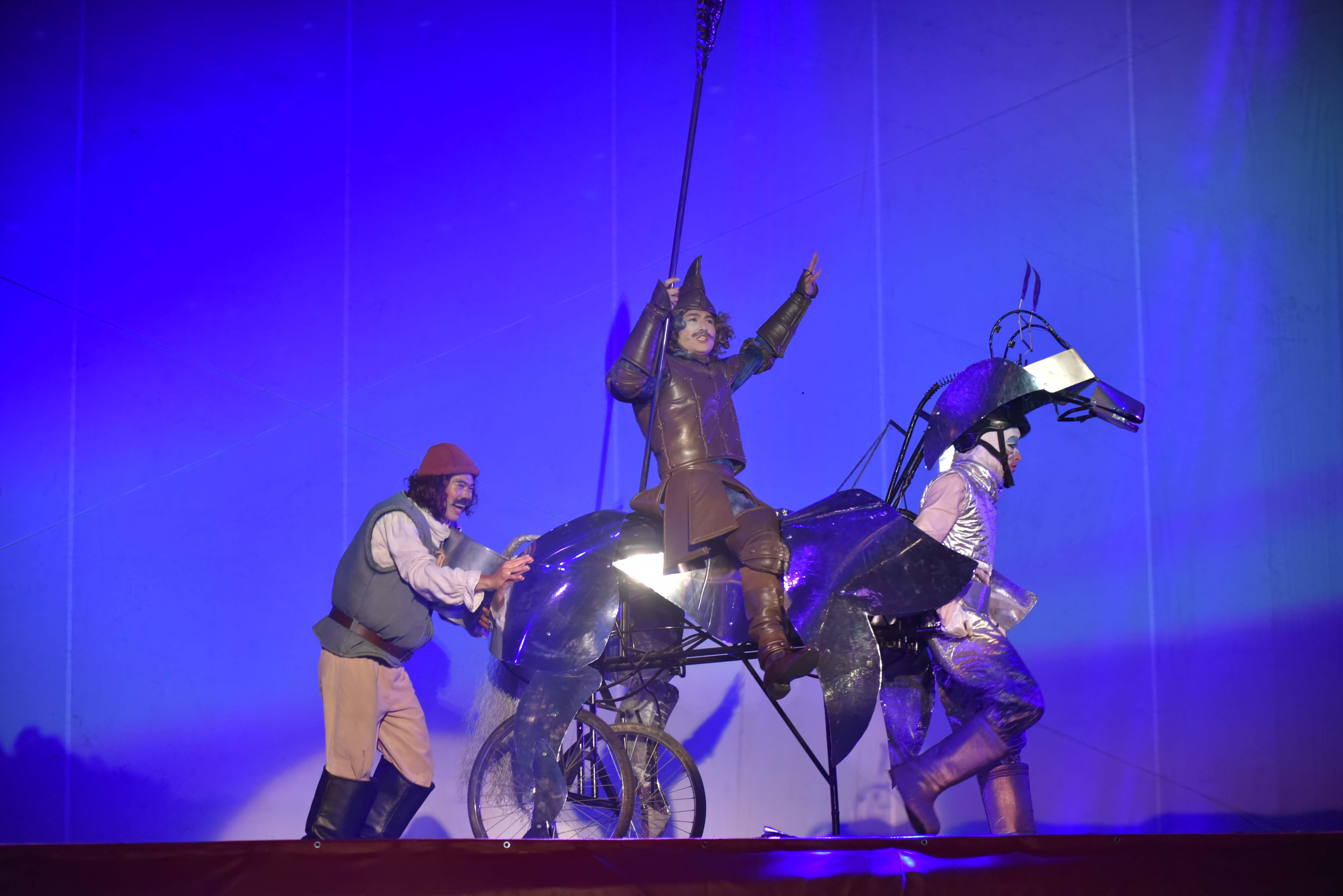 紙風車劇團說明,《唐吉軻德冒險故事-銀河天馬》,是劇團睽違8年,讓最受歡迎的英勇騎士「唐吉軻德」和三頭巨龍,重回圓滿戶外劇場的經典大戲!改編自西班牙劇作家塞萬提斯的作品,描述唐吉軻德帶著忠心的隨從「桑丘」和心愛的座騎老瘦馬「難騎」,挑戰風車巨人;卻在無意間發現桑丘媽媽生前經常佩戴的夜明珠不見了,決心發揮騎士精神,為桑丘尋回夜明珠,彌補心中遺憾。