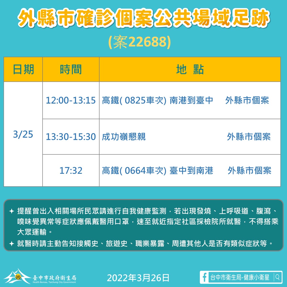 台中市政府衛生局今(26)日接獲外縣市通知本土確診個案22688,為本國籍50多歲男性,3月25日有台中市活動足跡,相關足跡已通知全面清消,並掌握接觸者11人,皆已安排採檢。