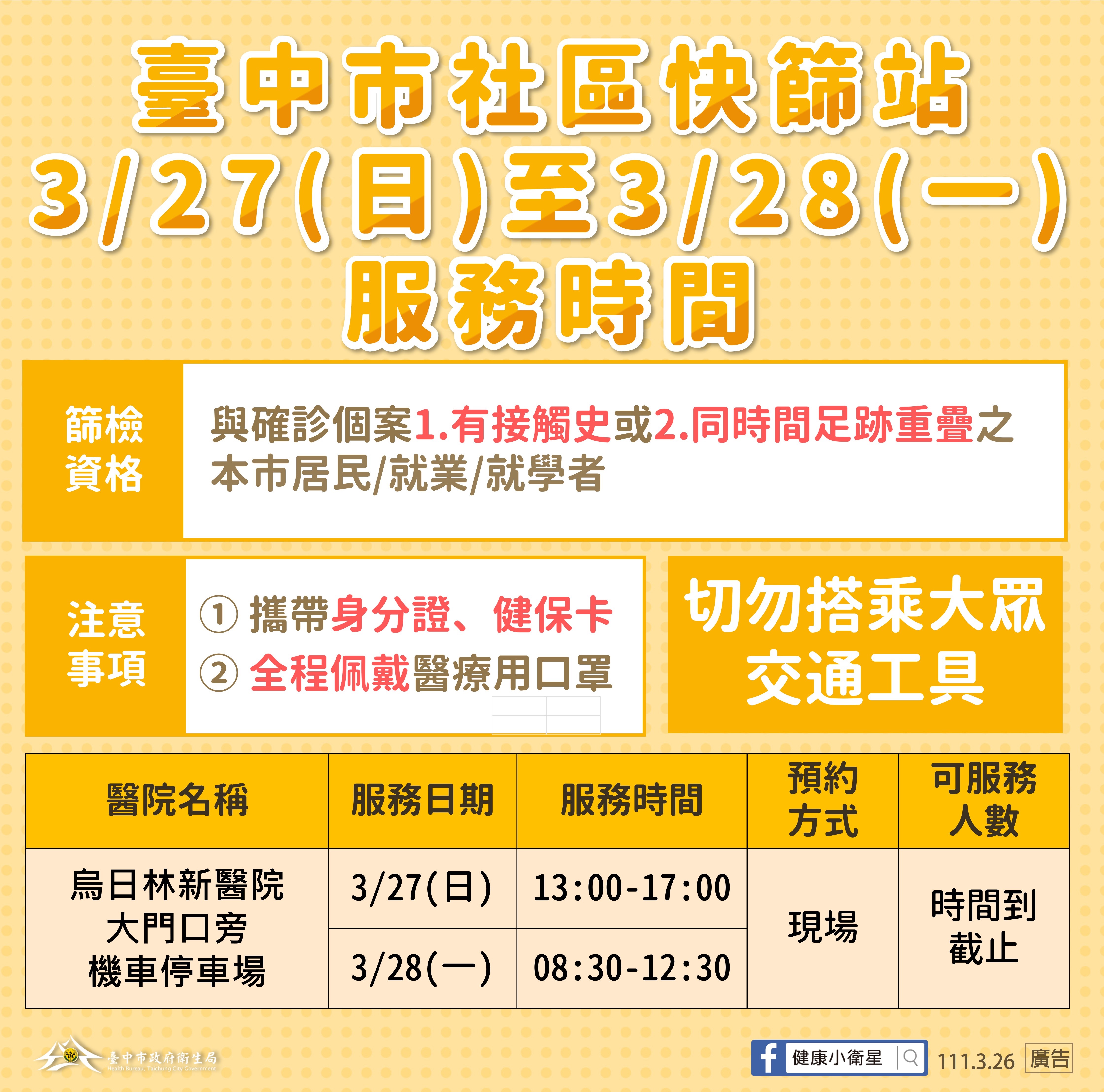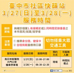 衛生局說明,市府接獲通知後立即展開疫調,個案於3月25日上午搭乘高鐵至台中市後,由友人接送至成功嶺懇親,隨後與家人一同搭乘高鐵返回北部,市府秉持寧嚴勿鬆態度,掌握接觸者11人皆已安排採檢。此外,3月27、28日將於烏日林新醫院開設快篩站,請同時間有足跡重疊的民眾前往篩檢。