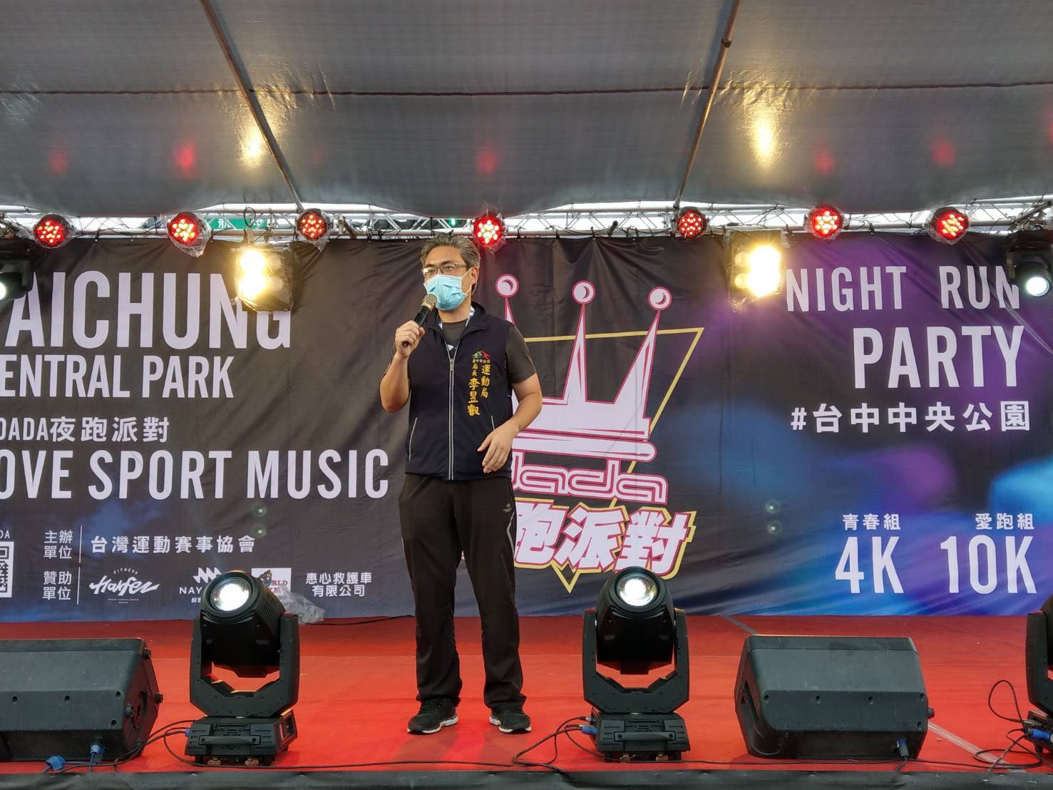 「DADA NIGHT RUN 夜跑派對-台中站」今(26)晚熱鬧開跑!運動局長李昱叡代表市長盧秀燕出席感謝主辦單位歷年大力推動路跑、馬拉松等運動,帶動城市運動風氣,促進市民身體健康,也為各位參賽者加油打氣,期許一起跑出活力與健康。