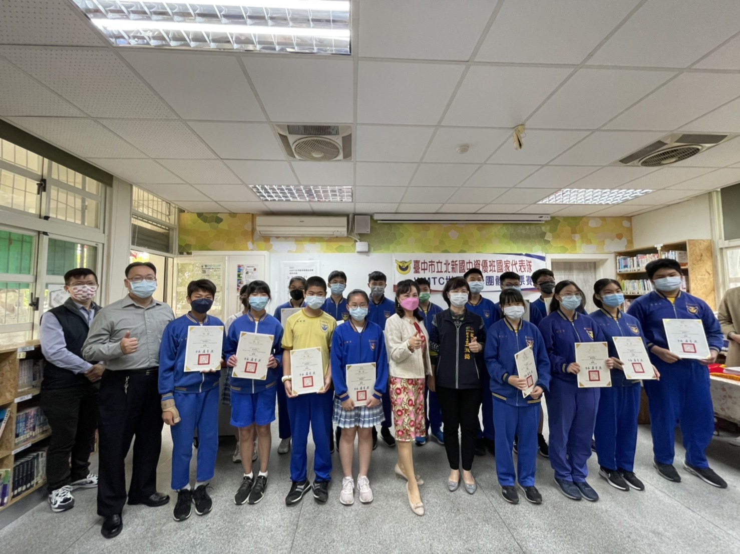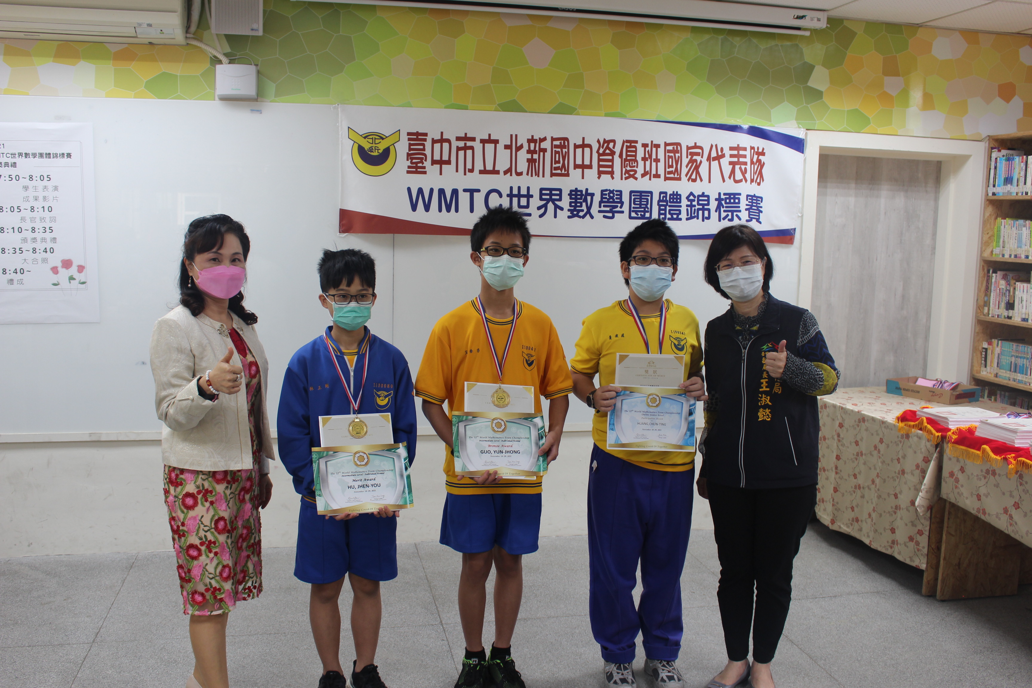 2021年WMTC(世界數學團體錦標賽)去年11月28日舉行,受全球疫情影響,主辦單位授權在各國辦理。17國297支隊伍同步競賽,台中市北新國中奪下個人獎項包括世界金牌3位、世界銀牌13位、世界銅牌34位、世界優勝32位,並獲團體組第18名,成績耀眼。「北新學生真棒!」教育局副局長王淑懿今(1)日代表市長盧秀燕頒獎肯定學生用心努力的成果,也感謝校長林慧娟的領導、老師們犧牲假日栽培學生,才有好成績,為台中也為國爭光。