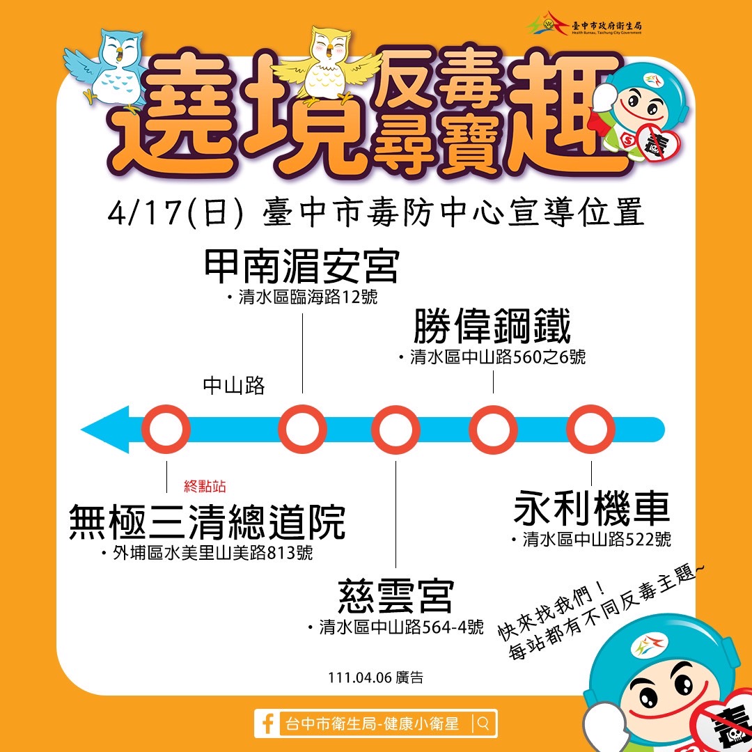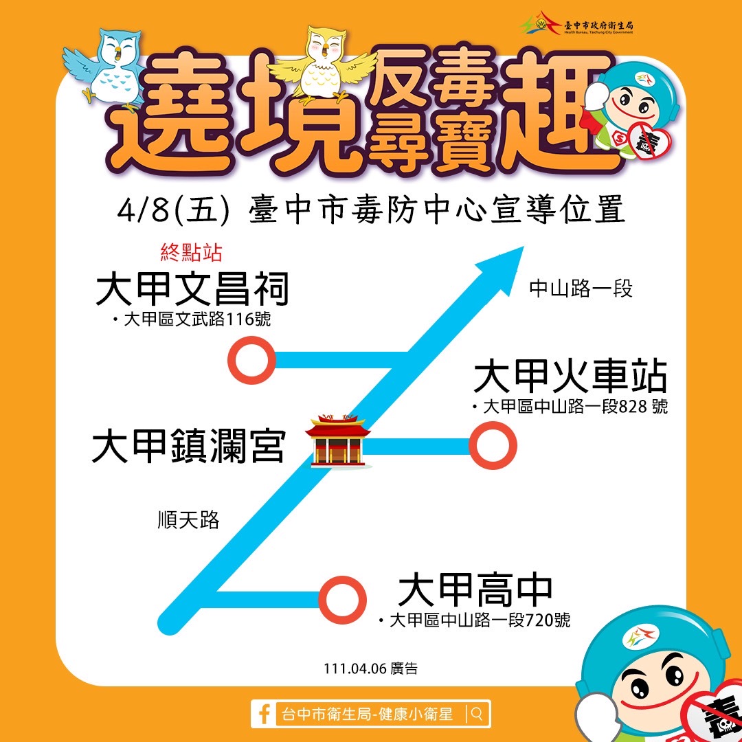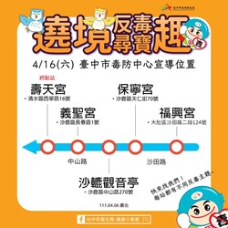 國內宗教大事大甲媽祖遶境將於後(8)天起駕,每年吸引百萬信徒參加,一起瘋媽祖,台中市政府衛生局後天於大甲鎮瀾宮周邊,41617日於大肚區、沙鹿區及清水區沿途地點,設置「遶境反毒尋寶趣」,結合在地文化拉近民眾距離,提醒多一分警覺,少一分危險,拒絕毒品進入家園。