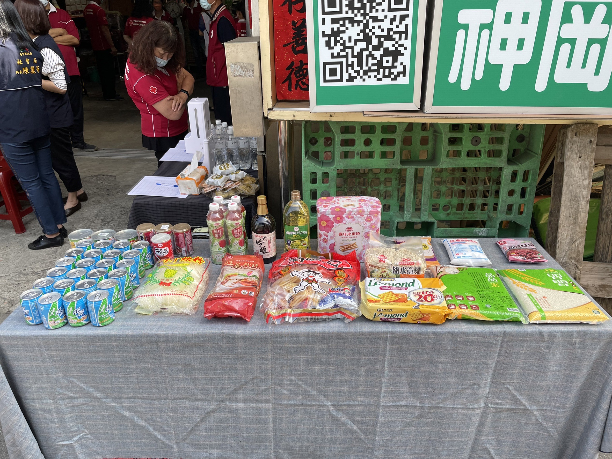 彭局長表示,知名企業透過市議員張彥彤媒合,捐贈100份供品,每份供品包含白米、麵條、油品、罐頭、飲料等日常用品和物資,幫助弱勢民眾。其中,分別配予台中市愛心食物銀聯盟店「社團法人台灣陽光婦女協會」與「台中市紅十字會神岡服務處」各50份受贈物資。