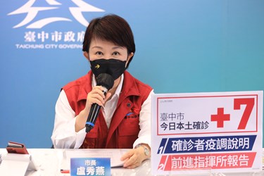台中市今(9)日新增7名本土確診個案,包含市府昨日公布無全國案號3名,為案26515、26516和26517,另4名,案26518、26519為朋友;案26779為沙鹿國中生,案26780為花蓮醫療院所群聚案(24870)的家人。市長盧秀燕表示,為有效圍堵疫情,市府已規劃即日起每天開設社區篩檢站,呼籲市民如有疑慮即前往篩驗,「每多篩驗一個陰性,就多一個家庭安心!」