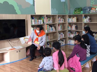 故事志工戴祖亮說明,在擔任「建築師說建築」故事志工前,從不認為他與繪本、說故事有任何連結,但透過說故事的經驗,發現繪本內容深具教育意涵,且在與孩童互動中得到的成就感及快樂,是擔任建築師所無法獲得。