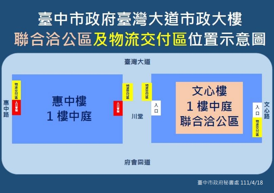 面對國內疫情延燒,台中市政府自4月18日起重啟台灣大道市政大樓文心樓1樓、文心第二及陽明市政大樓1樓中庭的聯合洽公區,而台灣大道市政大樓惠中樓整棟、文心樓、文心第二及陽明市政大樓2樓以上為僅限市府員工進出的管制區域,市府秘書處表示,民眾欲進入管制區域參加會議、訓練與活動,可憑開會通知等證明文件進入。