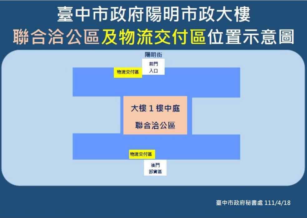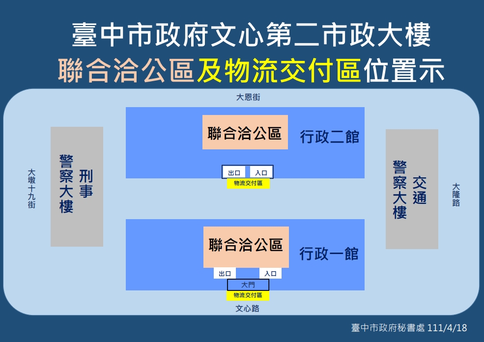 秘書處表示,由於各縣市確診數增加,考量全台已是密不可分的共同生活圈,市府設置聯合洽公區,除可縮短洽公時間,降低民眾非必要接觸風險,也能確保公務運作順暢,以積極投入防疫及各項為民服務工作。此次調整市政大樓門禁管制,民眾洽公請改至台灣大道市政大樓文心樓1樓、文心第二及陽明市政大樓1樓中庭申辦。