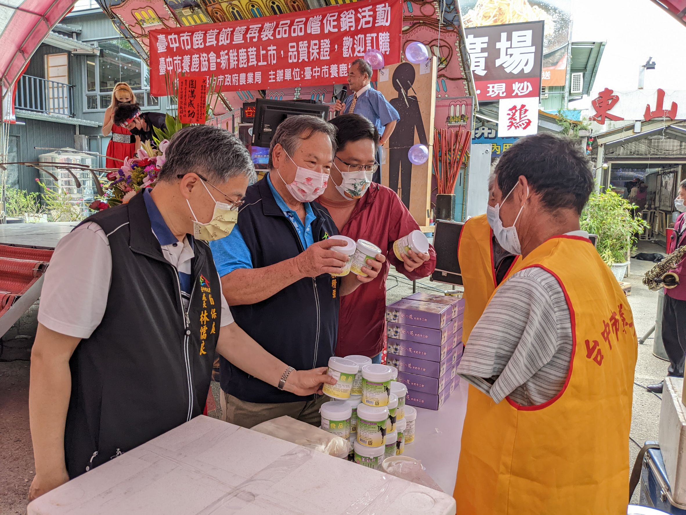推廣在地畜產品!台中市政府農業局長蔡精強今(16)日到場支持台中市養鹿協會在北屯區東山廣場舉辦的「111年度鹿茸節暨畜產品促銷活動」,並邀請養豬協會、養雞協會、養羊協會等畜牧團體共同參與,以凝聚台中市畜牧產業合作交流,也可免費外帶鹿茸燒雞酒品嘗及欣賞一連串表演,現場更以優惠價格行銷品質優良的鹿茸酒、鹿肉香腸、豬肉乾、甘蔗雞、羊奶等產品。
