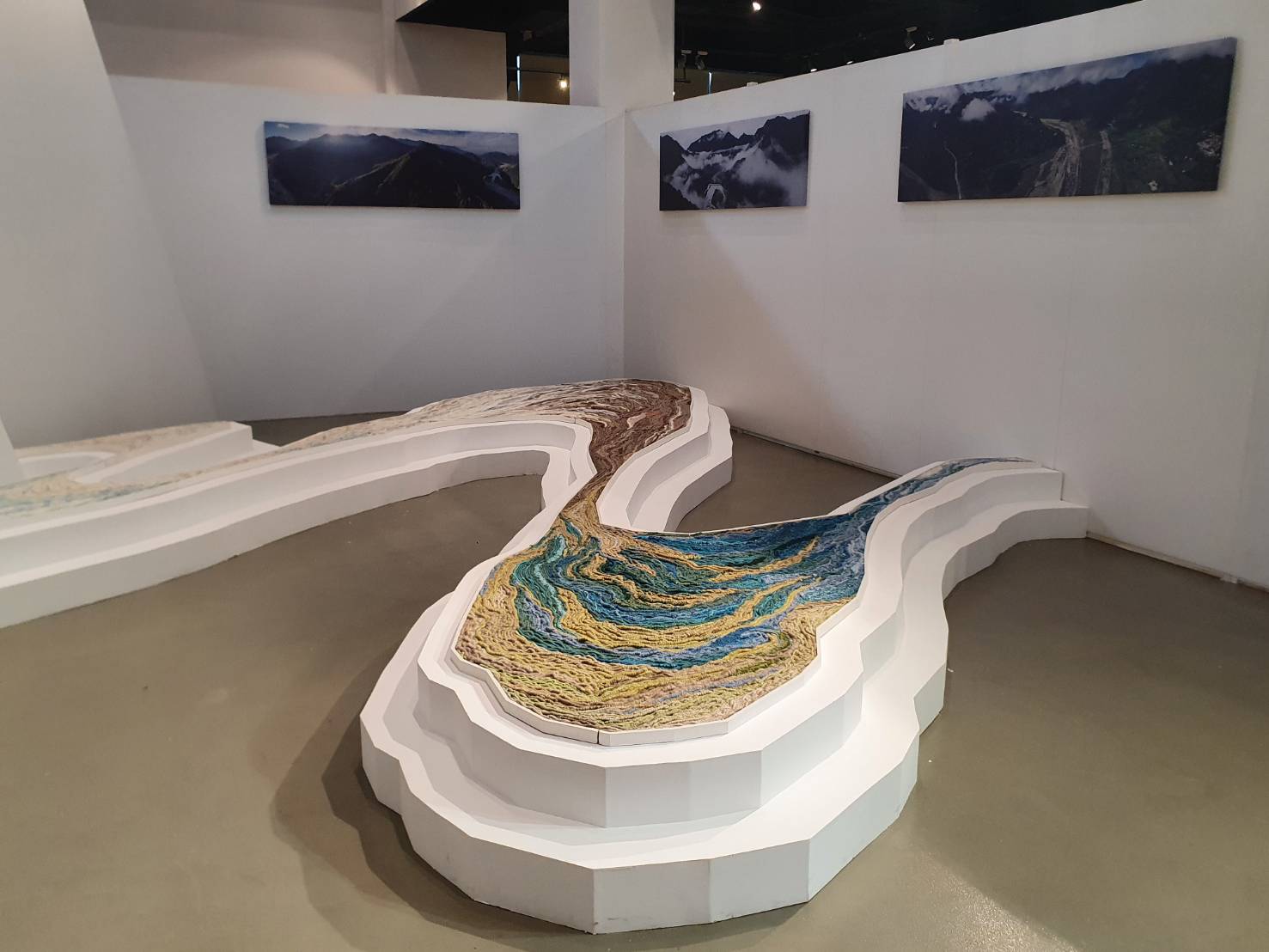 文化局說明,現場除有實景攝影、泰雅織品與婚慶主題的服飾外,也展出《島嶼四季-秋山》、《河殤》的大型纖維藝術創作,以泰雅織品工藝為基底,呈現出深厚的文化底蘊與歷史省思。《島嶼四季-秋山》以泰雅族各支系披肩中的圖紋、色彩布料組合而成,象徵民族基因般的圖紋;《河殤》呈現泰雅族人面對大安溪遭逢天災與人禍下,如同無力護佑幼童的深沉感傷。今日同時舉辦「泰雅傳統織品技藝交流工作坊」,由尤瑪‧達陸親自帶領學員探索原住民傳統編織技藝。