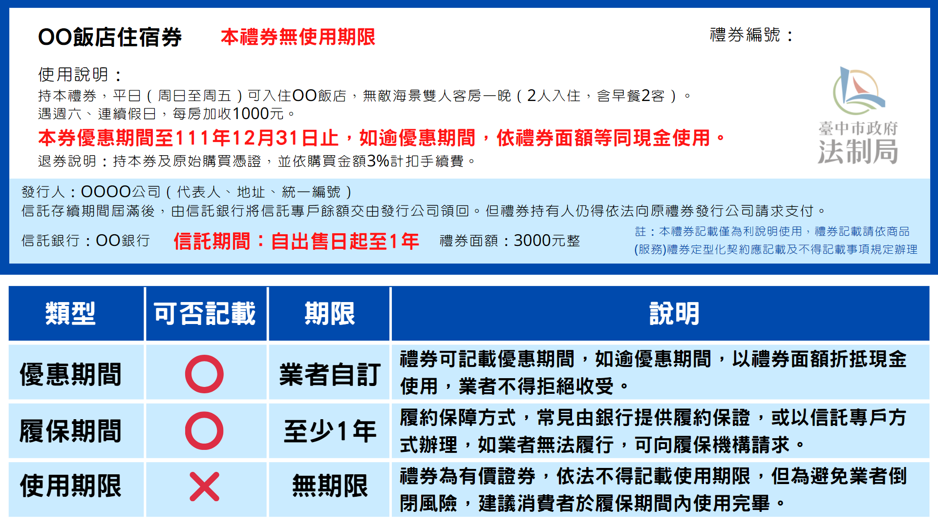 法制局說明,今年春季旅展主辦單位行銷廣告推出各餐券、住宿券及1元旅遊商品競標等促銷活動。業者販售具一定金額的住宿券、餐券,不論是紙本票券、電子票券,或是晶片(磁條)卡,原則上都屬於主管機關公告「商品(服務)禮券定型化契約應記載及不得記載事項」所稱的「禮券」,應依法規詳載「發行人資料」、「面額」、「至少一年的履約保障機制」及「退券的退費方式」等內容。