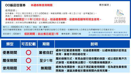 此外,禮券是消費者「先付款、後使用」的預付型商品,依規定不能記載使用期限;但有部分禮券會記載「優惠期間」,這是指業者依禮券提供特定商品或服務的期間,如面額800元禮券可兌換一客龍蝦套餐(門市價1000元),優惠期間6個月。若消費者未於優惠期間內使用,雖無法兌換禮券記載的指定商品,但仍可向業者主張依禮券面額當作現金使用,或請求退券。至於業者推出免費贈券的促銷活動,該贈品券則不適用前述的禮券規定,是可以「限定使用期限」。