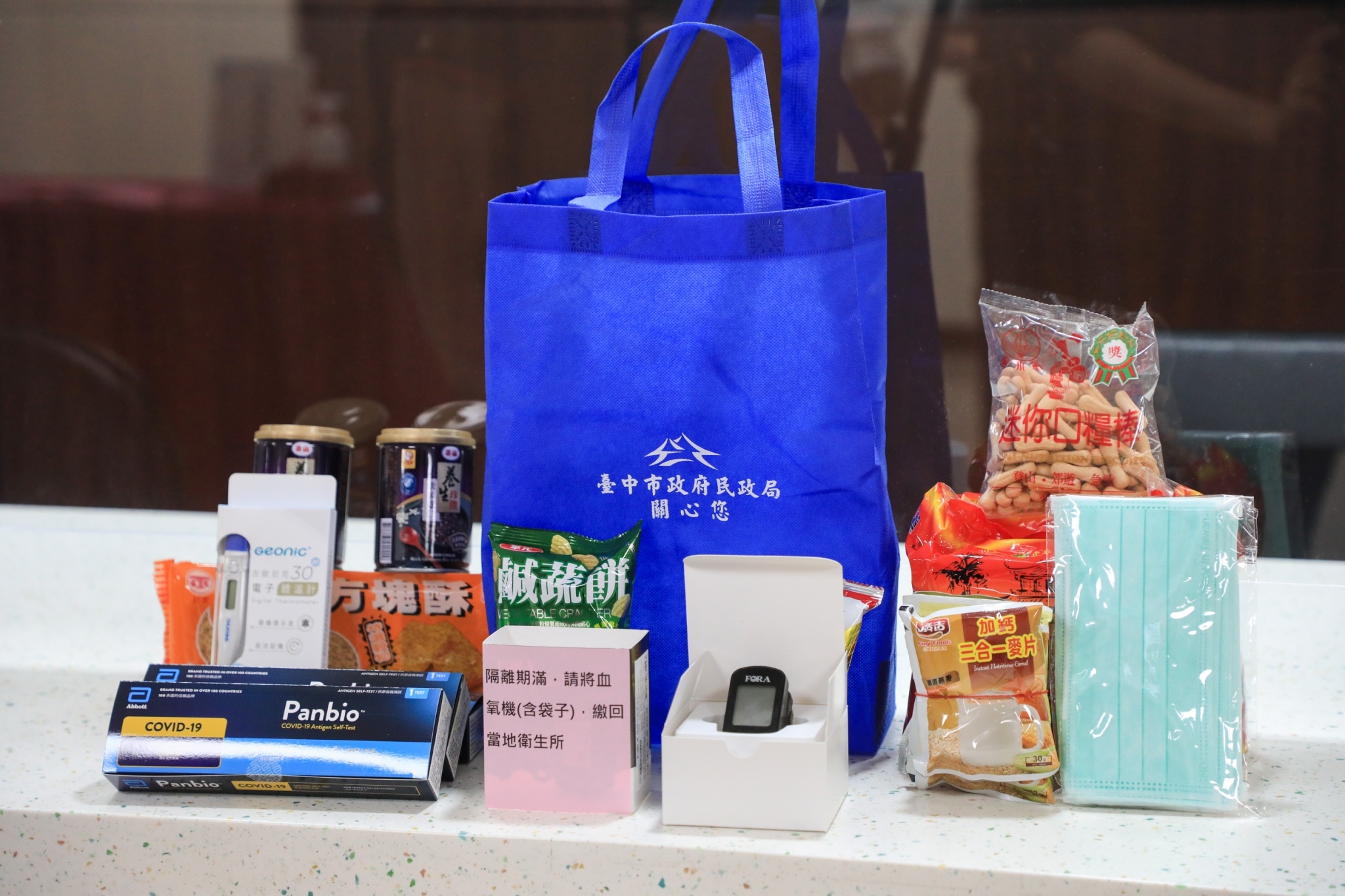 盧市長今日於現場介紹西屯區公所展示的居家照護關懷包,除泡麵、小包沖泡式麥片、餅乾、甜品及蔬果汁等食品物資,也附有居家照護者快篩試劑3劑、體溫計、垃圾袋、口罩及宣導單,並首創配置血氧機供民眾偵測血氧濃度。