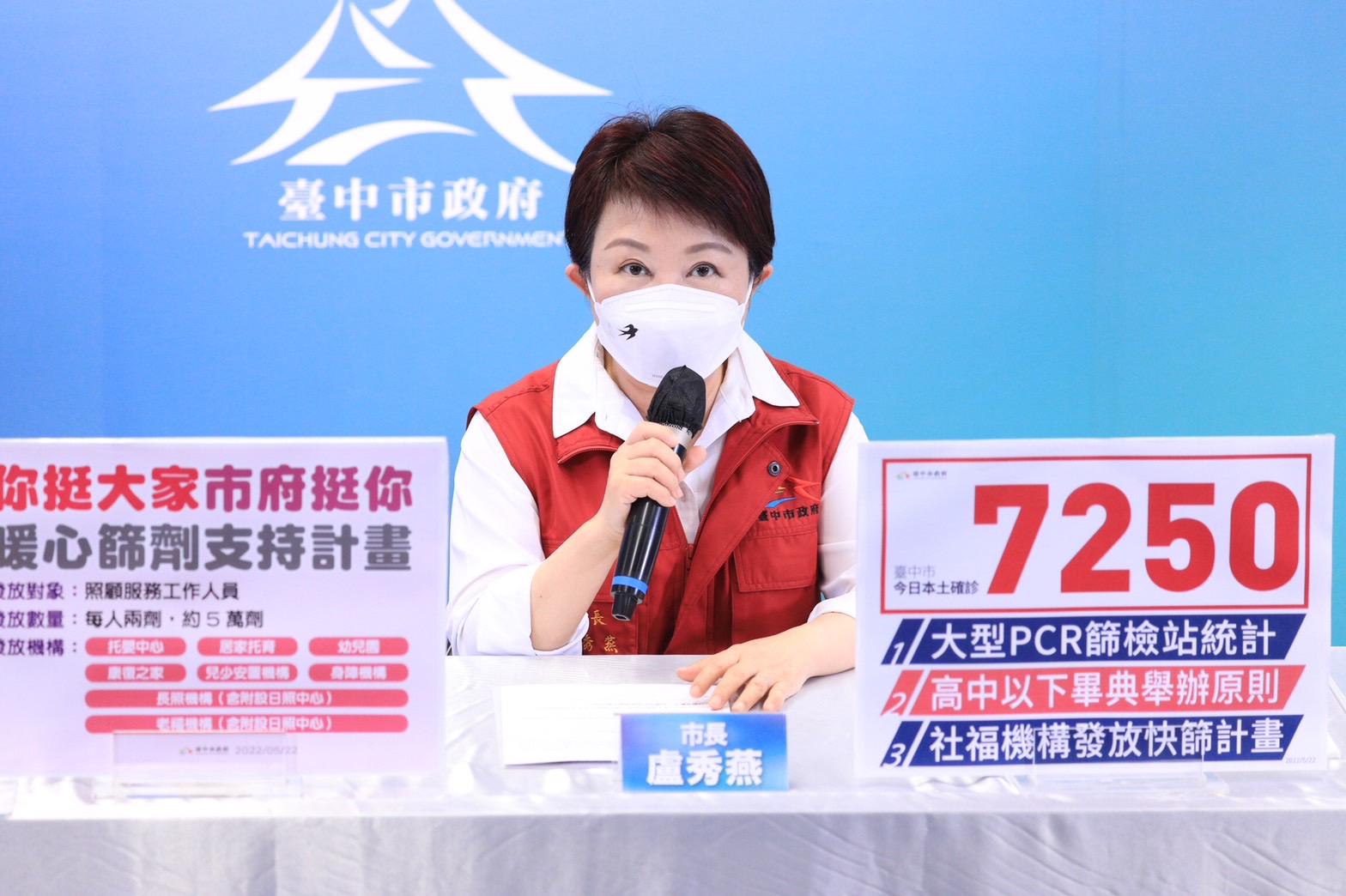 全國今(22)日新增7萬9441例本土個案,台中市新增7250例本土個案,市長盧秀燕今日於防疫記者會表示,統計至今日上午止,台中第一劑疫苗涵蓋率91.05%,第二劑85.43%,第三劑67.19%,第四劑(第二次追加劑)接種268人,總計接種人次近690萬人次。盧市長指出,成人BNT疫苗即日起開放預約施打,兒童BNT疫苗也提前至5月26日就能至醫療院所施打,請市民踴躍施打,提升防護力。